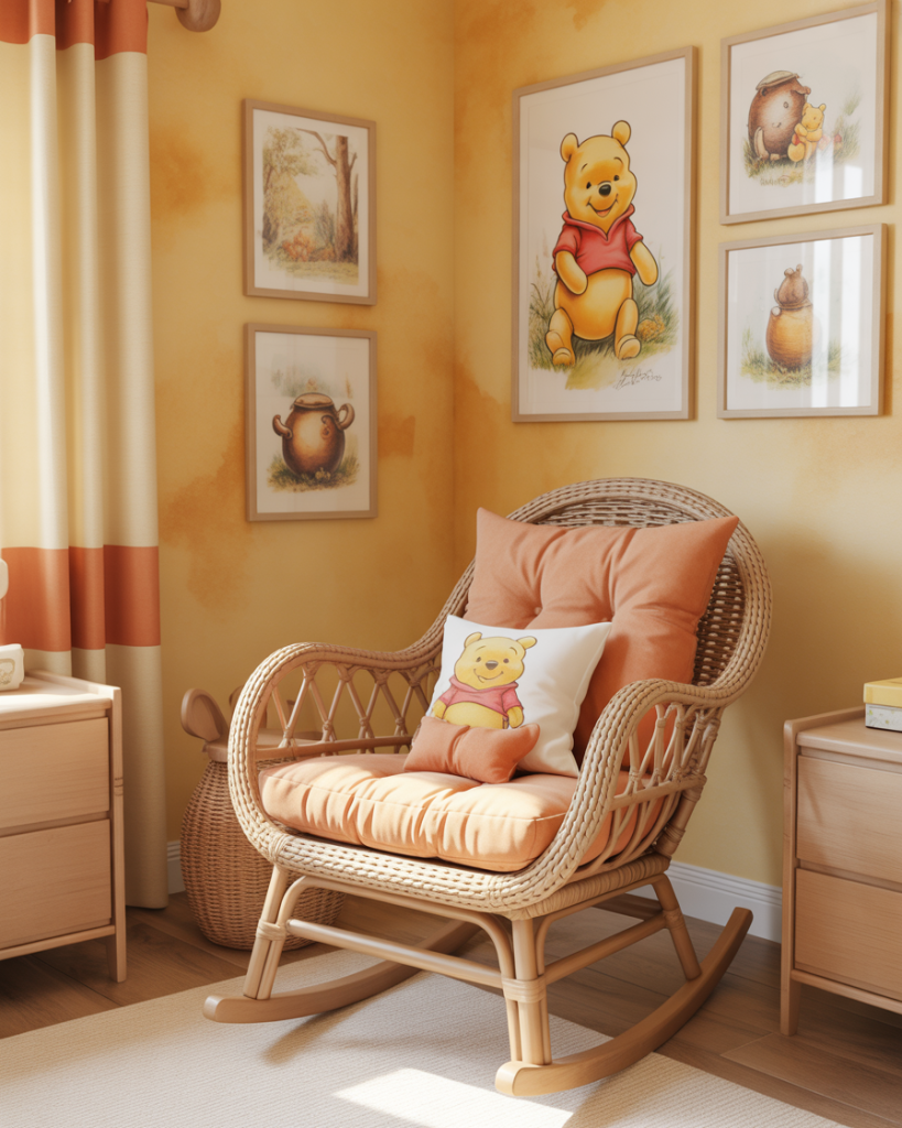 A Winnie the Pooh-inspired nursery captures the magic of childhood and classic storytelling. Use honey-gold and soft coral hues with linen and rattan textures. Incorporate bear motifs in wall art or bedding, and maybe a vintage bookshelf for a storytime nook. It’s a warm, comforting design full of personality and charm.