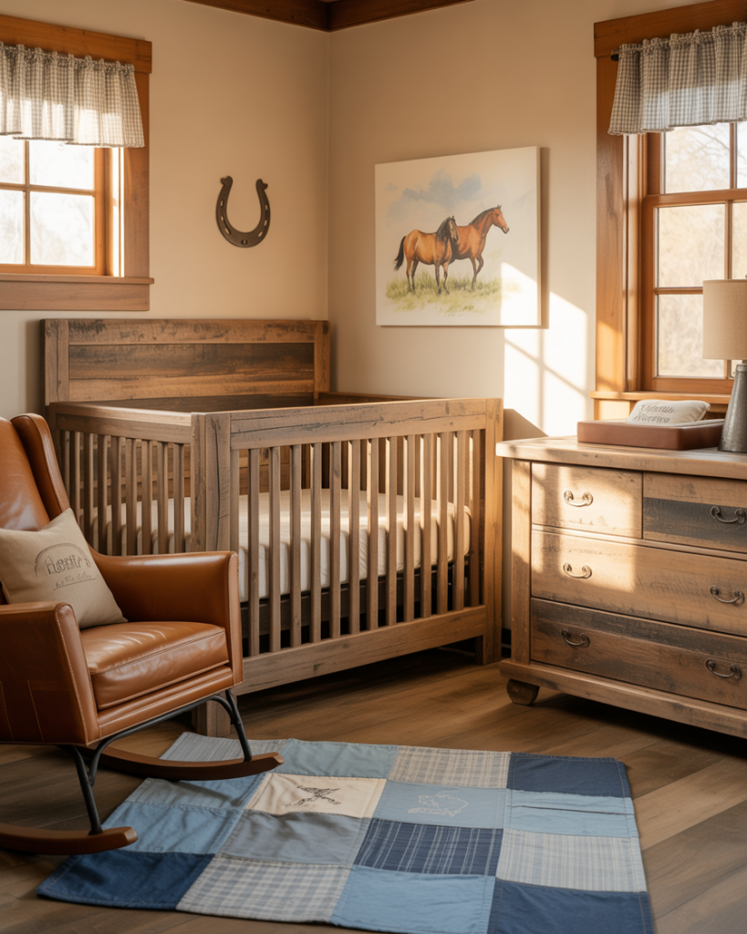 A rustic western nursery captures the essence of adventure. Use a palette of reclaimed wood, leather accents, and denim textiles. Include delicate horse or cactus patterns. Soft, neutral walls and warm, cozy surfaces maintain the style and balance of the room.