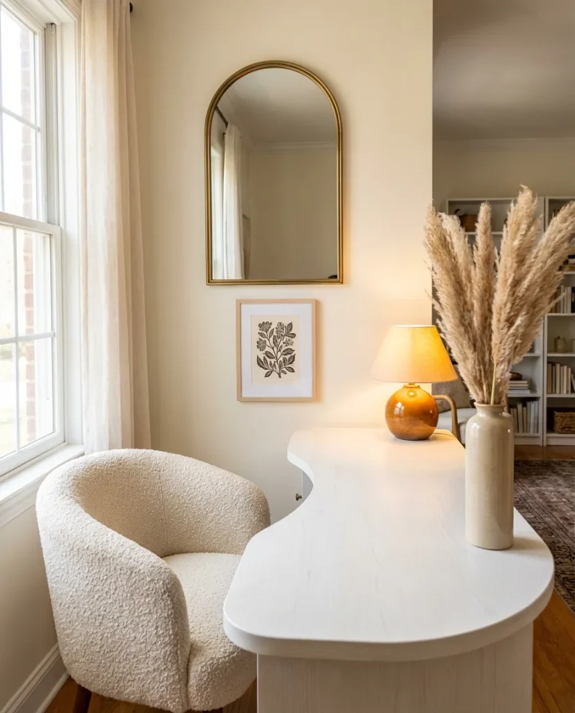 This style works best in dedicated rooms, but it’s absolutely adaptable for a shared space or even a bedroom nook. The real secret is negative space—leaving deliberate gaps on shelves and desk surfaces so the items that are there get to breathe and be noticed. Interior stylists who work with female entrepreneurs say this is a recurring lesson for clients: it’s not about having more beautiful things; it’s about editing down to the few things that genuinely resonate. One beautiful object in an empty space is always more powerful than ten fighting for attention.