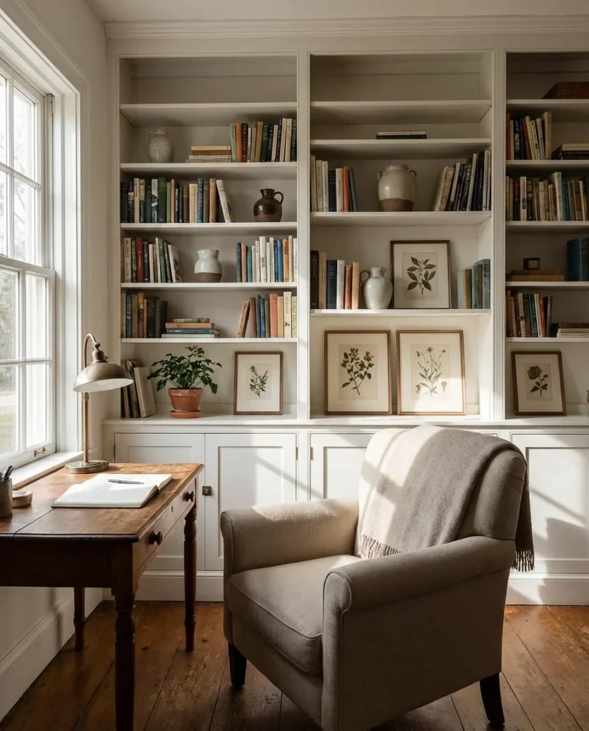 This aesthetic is surprisingly achievable on a moderate budget. The biggest transformation comes from paint and lighting—change those two elements, and you’ve done 80% of the work. Second-hand furniture from antique stores and thrift shops is often ideal here because the slight wear and age of the pieces adds authenticity rather than detracting from it. The micro-detail that pulls the look together is layered lighting: never rely on a single overhead source; instead, stack a desk lamp, a floor lamp, and perhaps a small table lamp in the corner for a warm, enveloping glow that makes long work sessions genuinely enjoyable.