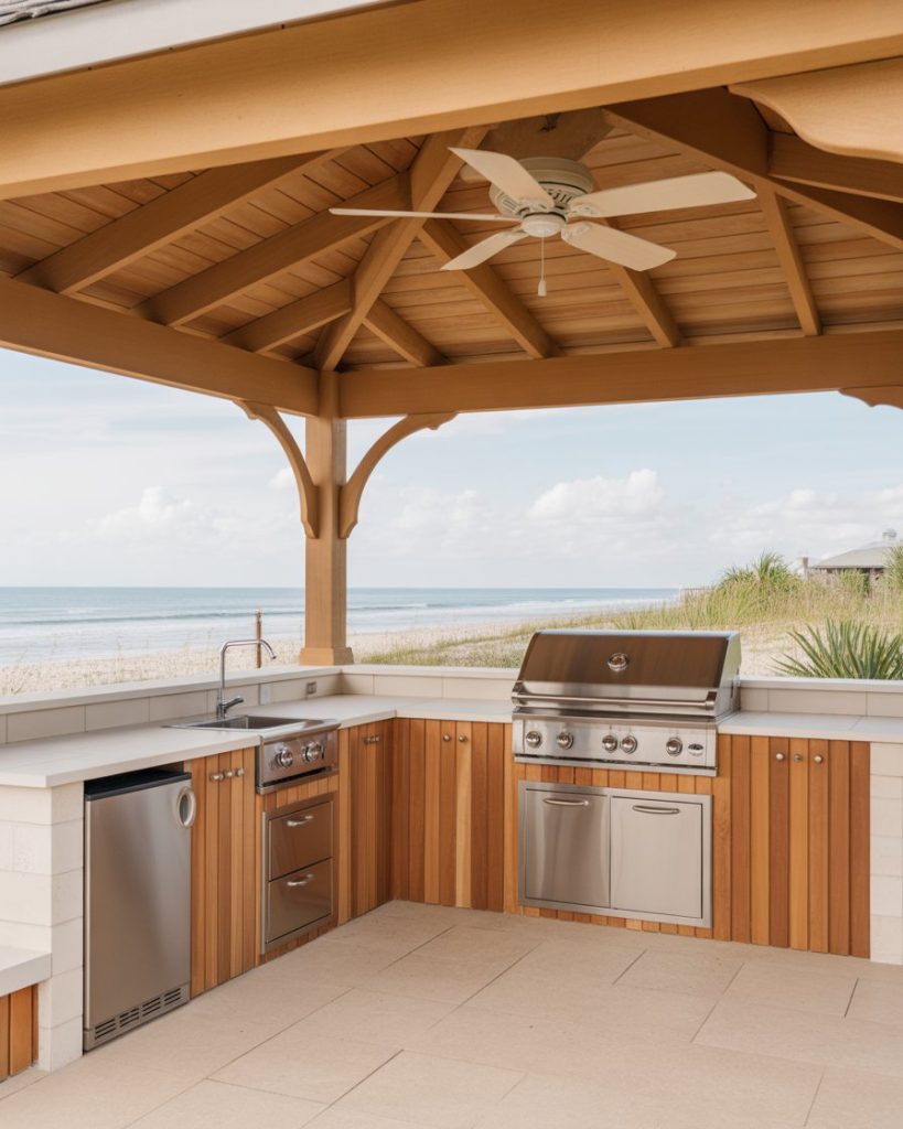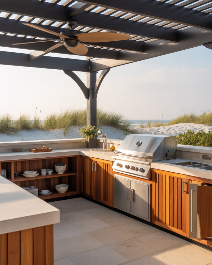 A covered outdoor kitchen with a breezy beach-house layout is perfect for humid climates, offering shade and comfort year-round. Pale stone counters, rope accents, and soft teak create a relaxed mood that feels like vacation at home. A neat layout grill area tucked under the roof keeps the cook dry even when the sky turns unpredictable, something I learned after watching a neighbor flip burgers in a summer storm.