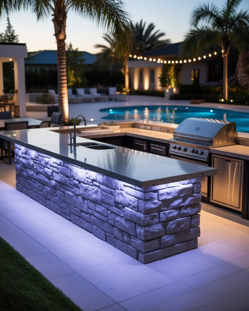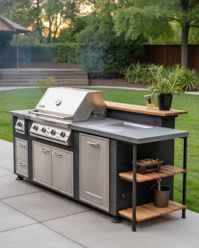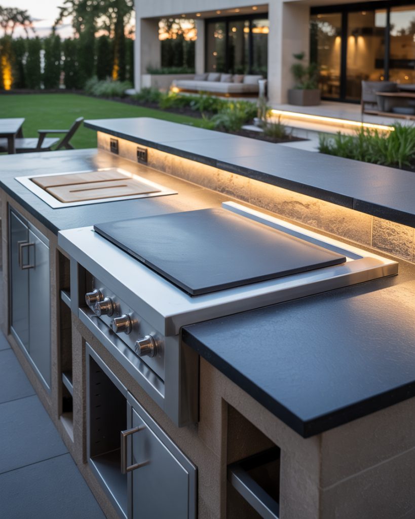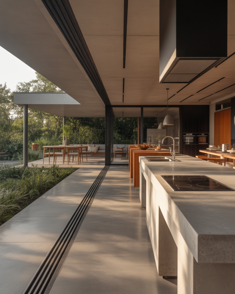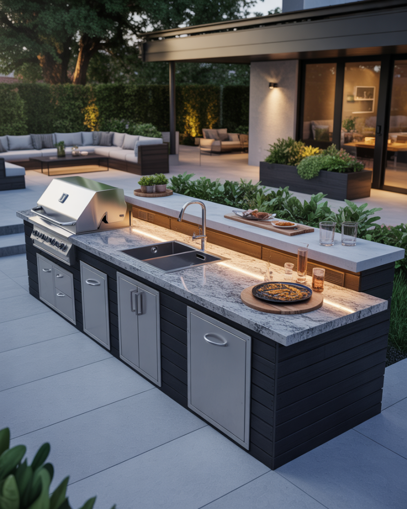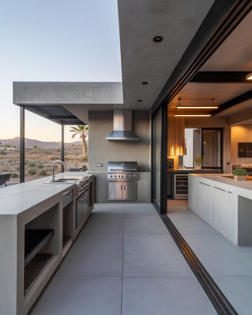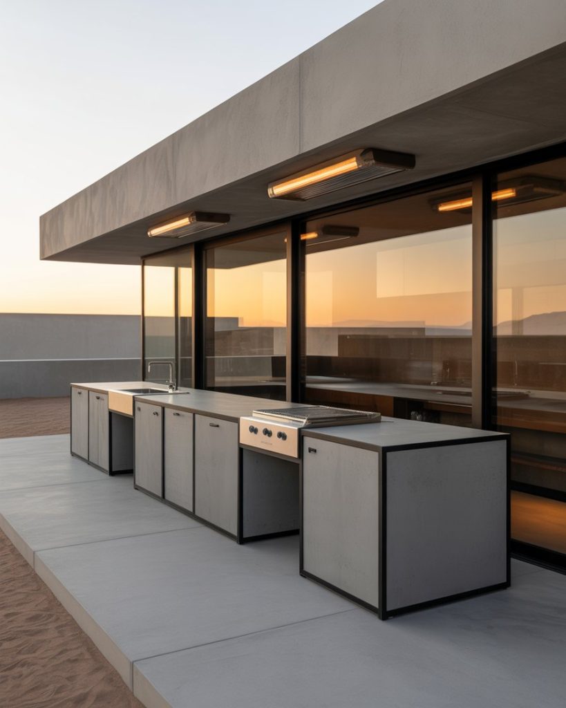 Constructing a modern outdoor kitchen using smooth concrete is a bold and timeless design choice. The low-maintenance but sleek design and cool gray tone match well with surrounding greenery and stonework. The integrated storage options conceal clutter to make the space feel open and calm. For contrast, a layout with a grill area extending along one wall with black metal trim works well. I once saw an example in Arizona where polished concrete shimmered beautifully during the sunset light. It was art, not architecture.