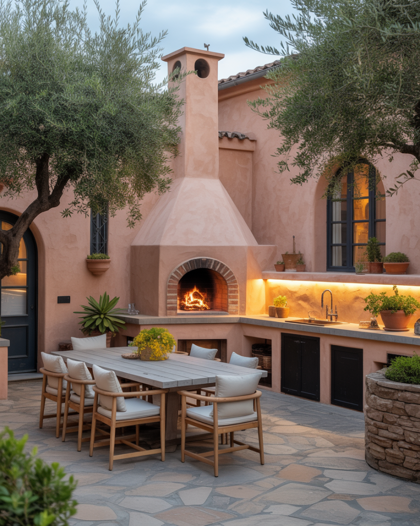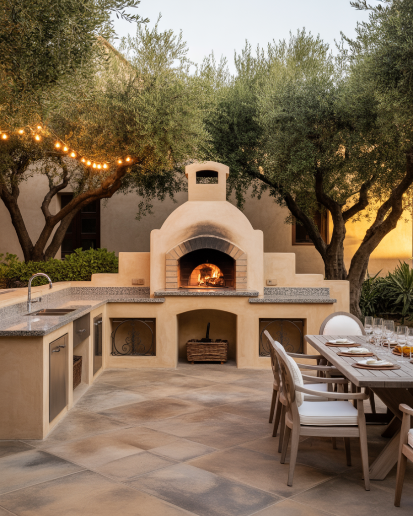 Cohesively combining coastal European design features, the open-air layout has stucco walls, terracotta tiles, and arched niches. It has the feel of a space that is centuries old but is also modern and recently built. Surrounding the central pizza oven, which is the heart of family gatherings, there are olive trees and herbs. This layout brings vacation charm home, even in suburban settings, where I once had the pleasure of dining in a Spanish courtyard. It was a wonderful experience, filled with warm air, sizzling bread, and endless laughter.