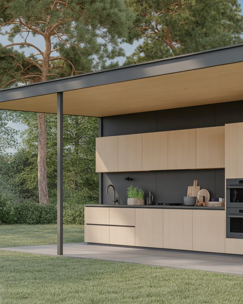 The ideas from Nordic homes influence outdoor design too. Pale wood counters, clean lines, and matte black fixtures create a peaceful space perfect for reflection. A covered canopy protects against weather without closing the view. Scandinavian kitchens often emphasize sustainability, using recycled timber or composite decking. Add a built-in layout grill area and cozy textiles for a minimalist yet warm atmosphere.