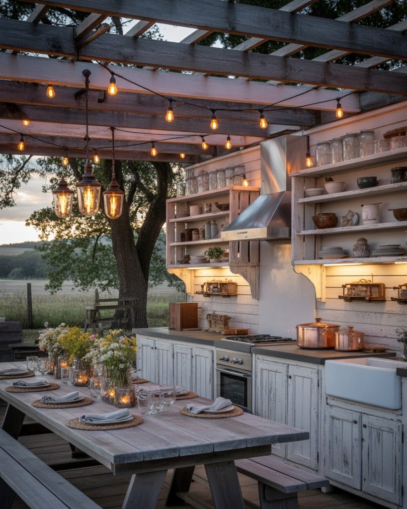 A rustic farmhouse kitchen under a pergola with string lights captures nostalgia and comfort. Think whitewashed wood, vintage lanterns, and open shelving stacked with mason jars. This setting turns every dinner into a small celebration. A layout grill area plan beside a long wooden table keeps the flow natural. Guests can chat with the cook as the aroma of grilled corn and bread fills the air.