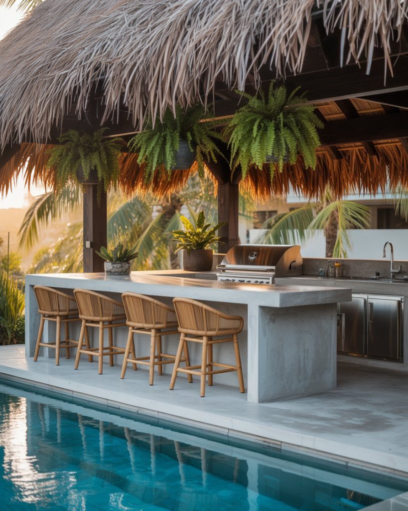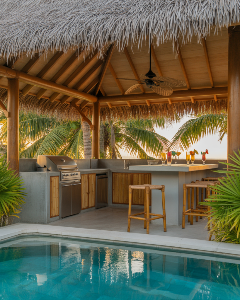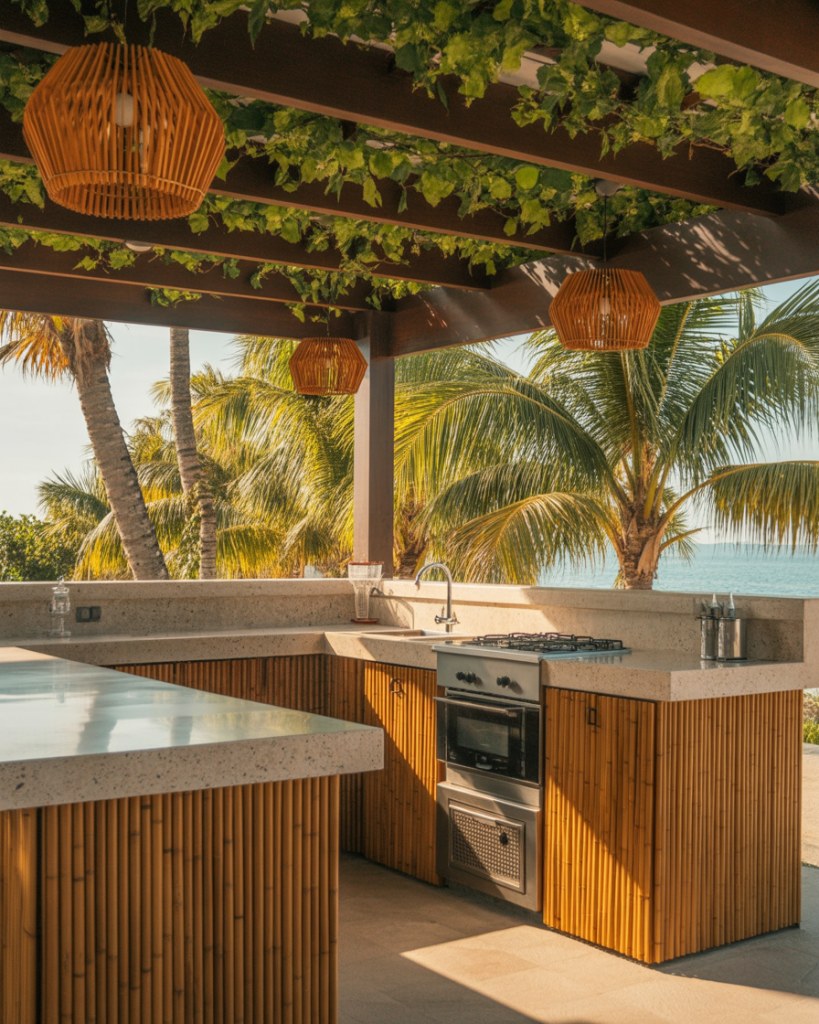 Inspired by the Philippines, this tropical layout uses bamboo panels, woven lamps, and cool concrete tops. Airflow is everything—open sides and ceiling fans keep the chef smiling even in humid heat. I once ate grilled tuna under a nipa hut roof in Cebu and finally understood why shade matters more than décor. Add a pergola with vines for an instant island mood.
