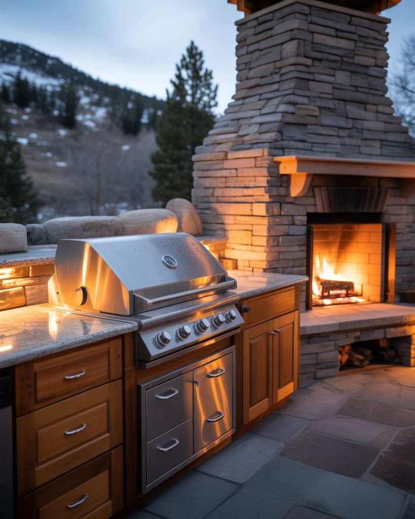 You can’t go wrong with the luxury of a grand stone fireplace and a luxury grill. In fact, it makes the perfect all-season cooking area since the setup radiates warmth long after dinner is over. That’s the perfect place to make a cozy winter grilling setup, and the stacked stone walls would bring a lot of nice texture to the room. The granite countertops and built-in cabinets are the perfect durable and elegant choices. I once saw this setup in a Colorado home, and it made winter grilling a nightly ritual with snow falling and steaks sizzling. Perfect.