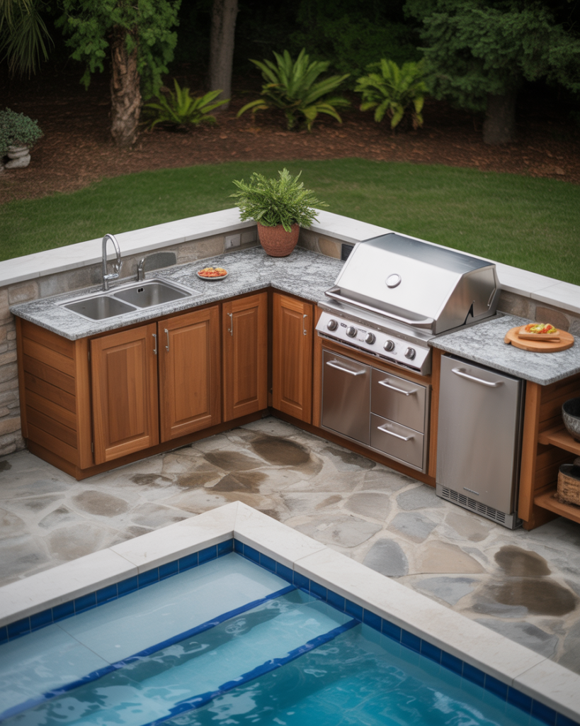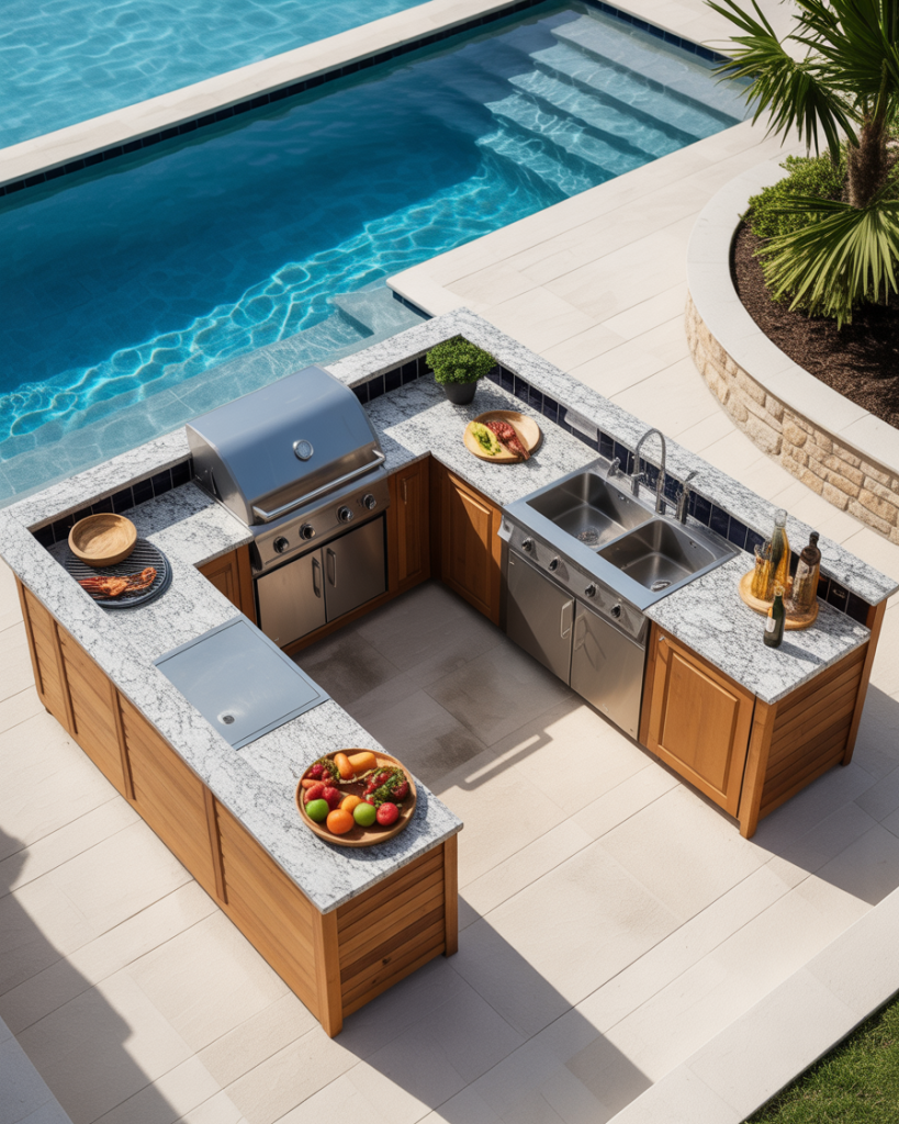 A poolside L-shaped kitchen layout keeps the cooking zone close to fun. One side for grilling, another for prep, all facing the water. This layout grill area plan encourages interaction—no one’s left out while tending the food. With waterproof cabinetry and granite tops, the design lasts through countless pool parties. Luxury meets laughter in equal measure.