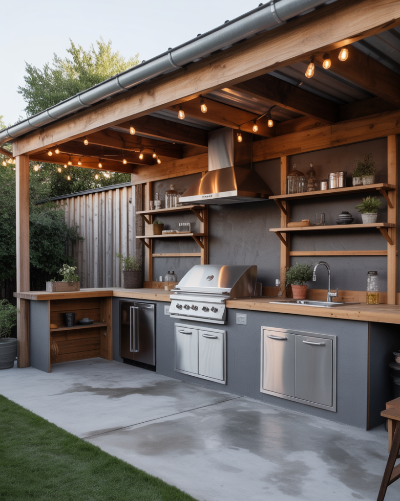 An industrial outdoor kitchen fuses raw metal with warm timber. Brushed steel appliances, thick wooden beams, and concrete floors make it striking and functional. Perfect for those who love urban style but want durability outdoors. A covered roof with string lights softens the edges, balancing grit with glow. Ideal for semi-open patios or converted garages.