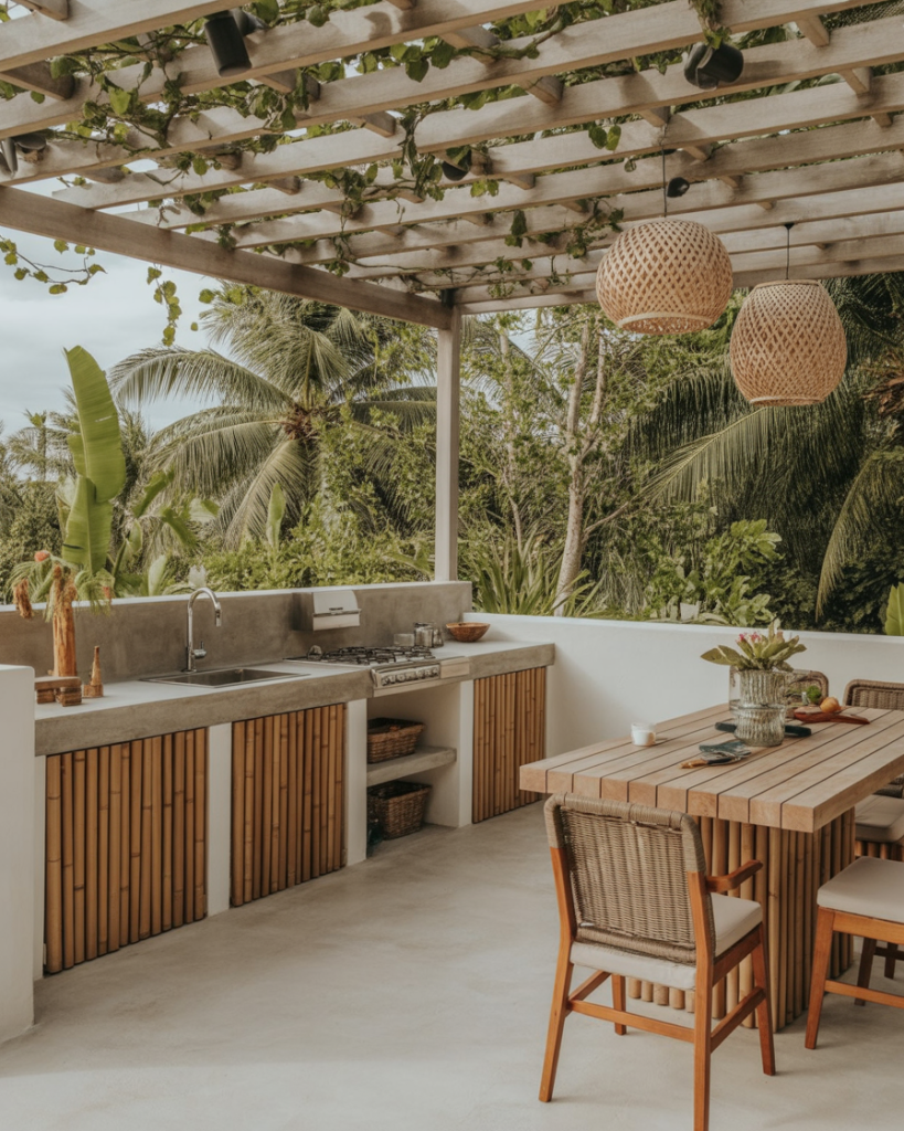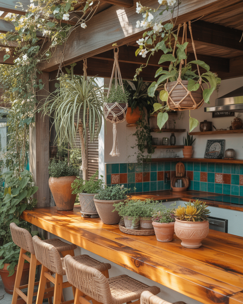 A relaxed open-air kitchen filled with patterns, color, and natural texture captures the Boho spirit. Macramé hangers, rattan stools, and clay pots set a joyful tone. Use reclaimed wood for counters and let vines grow naturally around the structure. It’s carefree yet deeply personal—exactly what an outdoor kitchen should be.