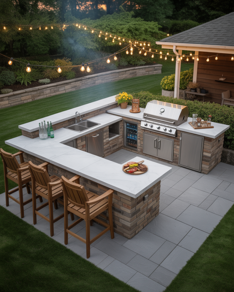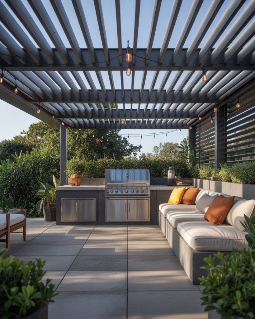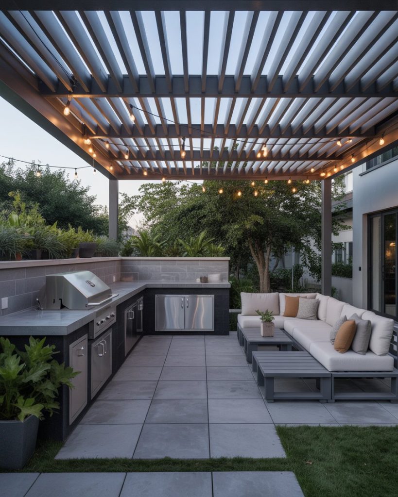 A semi-open kitchen under a pergola with adjustable louvers lets sunlight act like seasoning—just the amount you want. Add lounge chairs near the grill, and guests will stop wandering back indoors. Works well in long, narrow yards or “”L”-shaped patios where shade must be flexible. Evening string lights finish the mood without stealing the spotlight from the food.