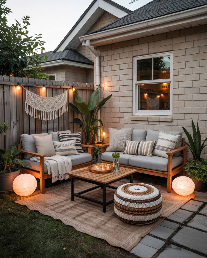 A cozy back patio can turn even a small space into a relaxing refuge using soft textiles, lanterns, and layered seating. I once refreshed a dull concrete square with nothing more than a thrifted rug and two floor cushions, and it instantly became the favorite chat spot among friends. This idea suits renters, busy parents, or anyone wanting comfort without a remodel. Focus on warmth, low seating, and lights that make the evening feel unhurried.