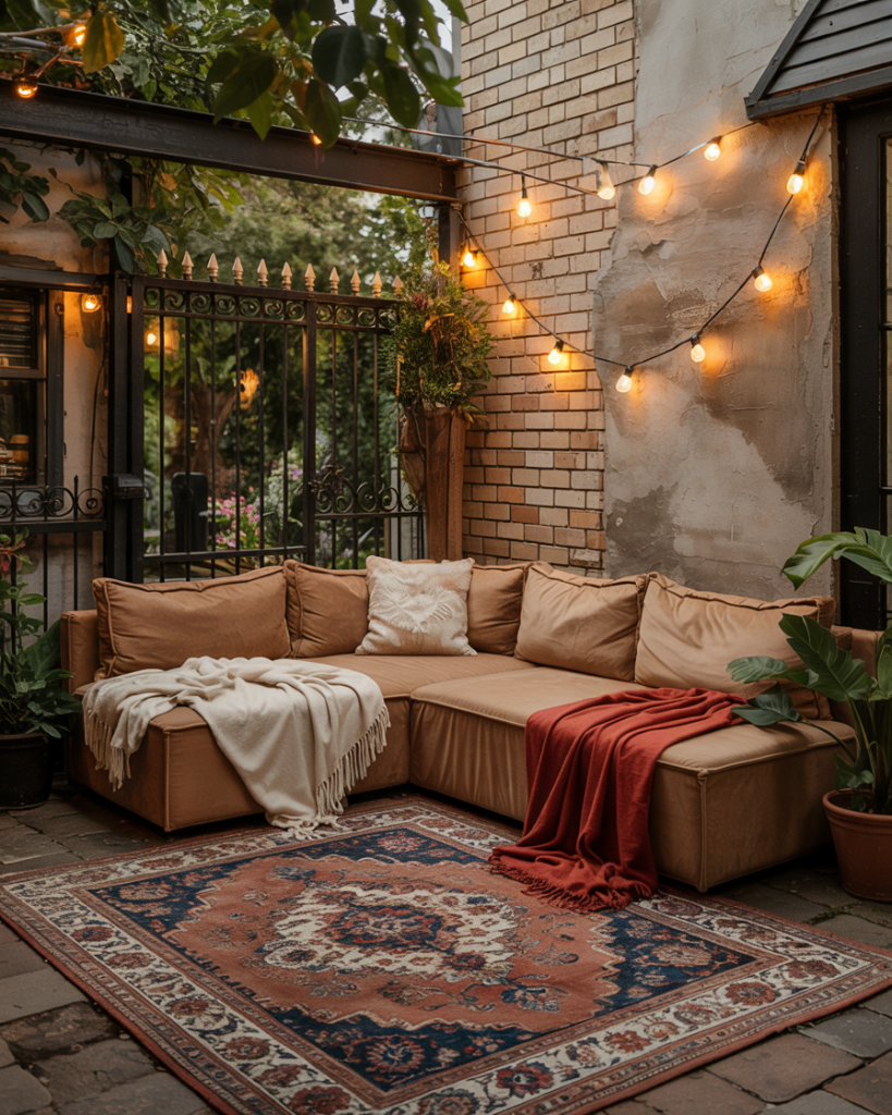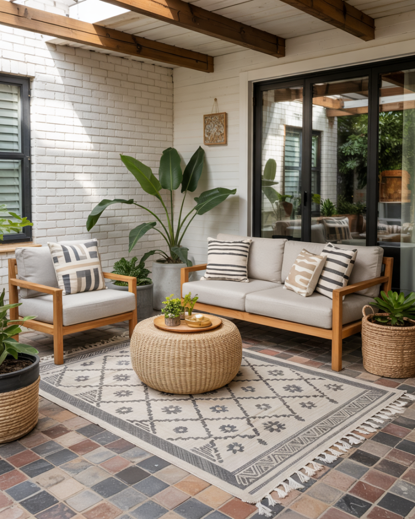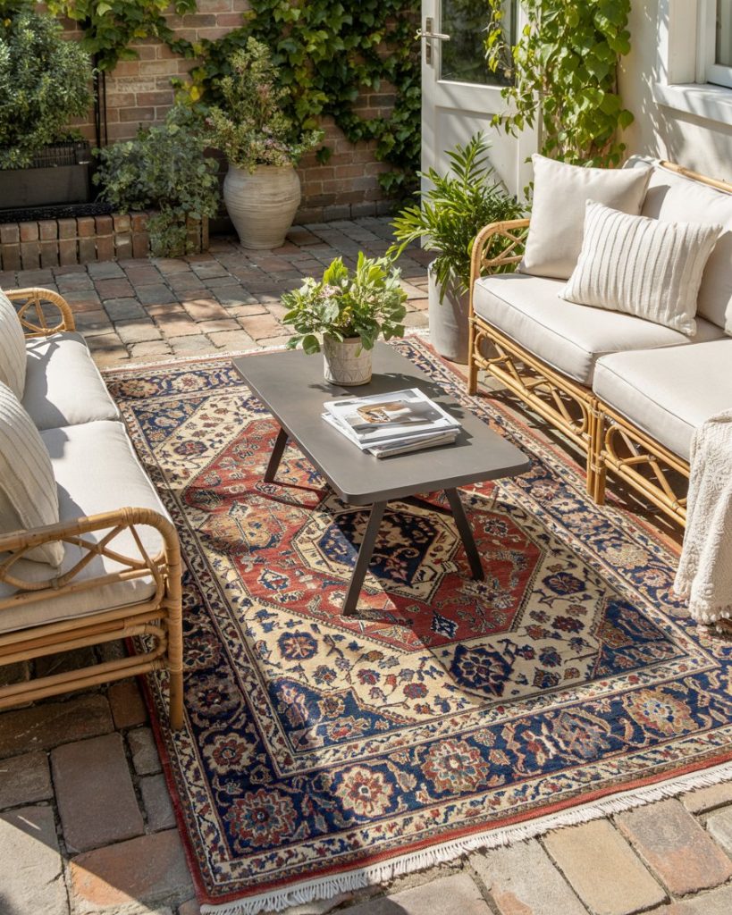 Bringing indoor rug style outside makes a patio feel finished. I layer a washable flat-weave under a patterned top rug to fake wall-to-wall comfort. It fools the eye and softens feet on tile or brick. Works anywhere from balconies to pergolas, especially for people who hate the “cold floor” vibe outdoors.