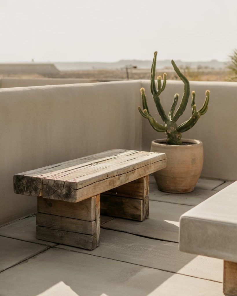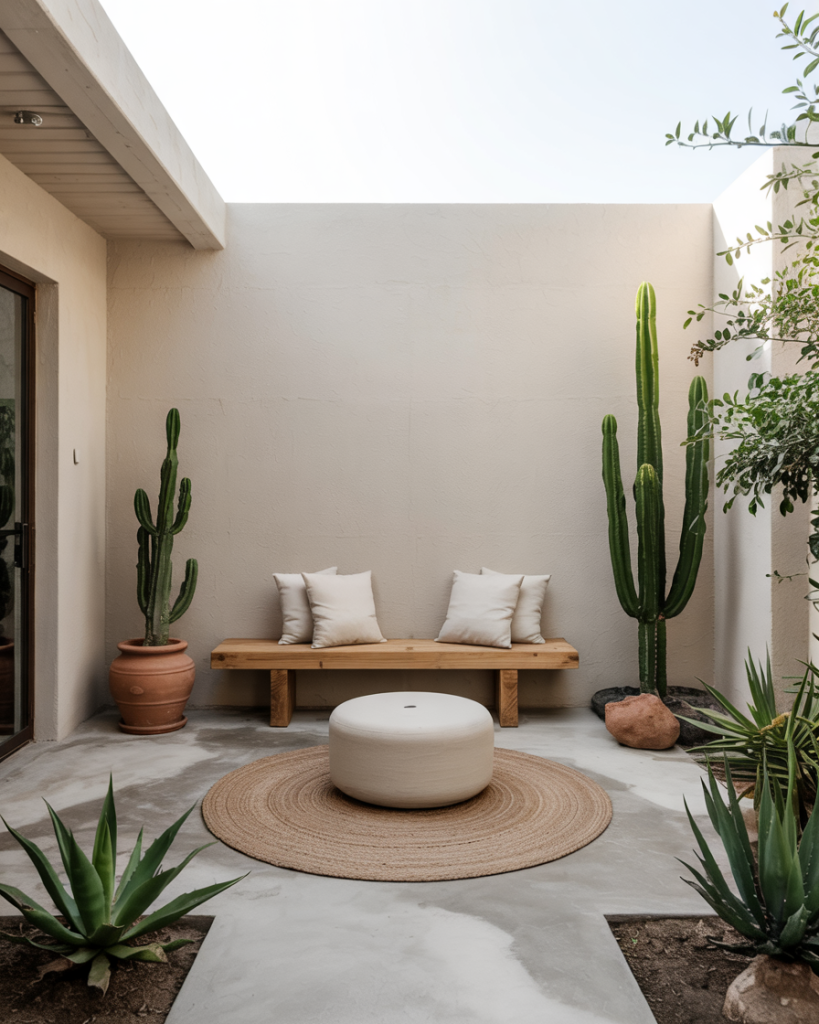 In dry climates, a concrete slab plus sun-bleached wood and gravel beds gives a serene, Joshua-Tree-style calm. Keep it sparse: one bench, one clay pot, and one sculptural plant. I once copied this look after a trip to Arizona, and my water bill thanked me. Great for low-maintenance living and lovers of clean lines.
