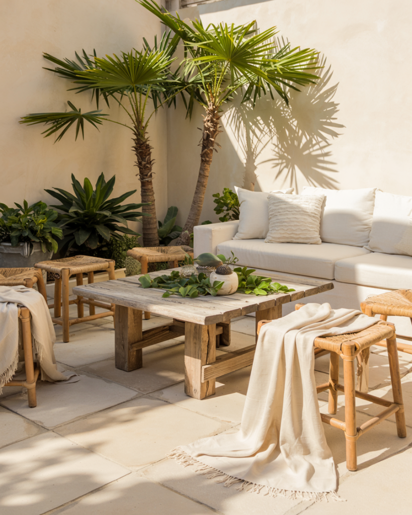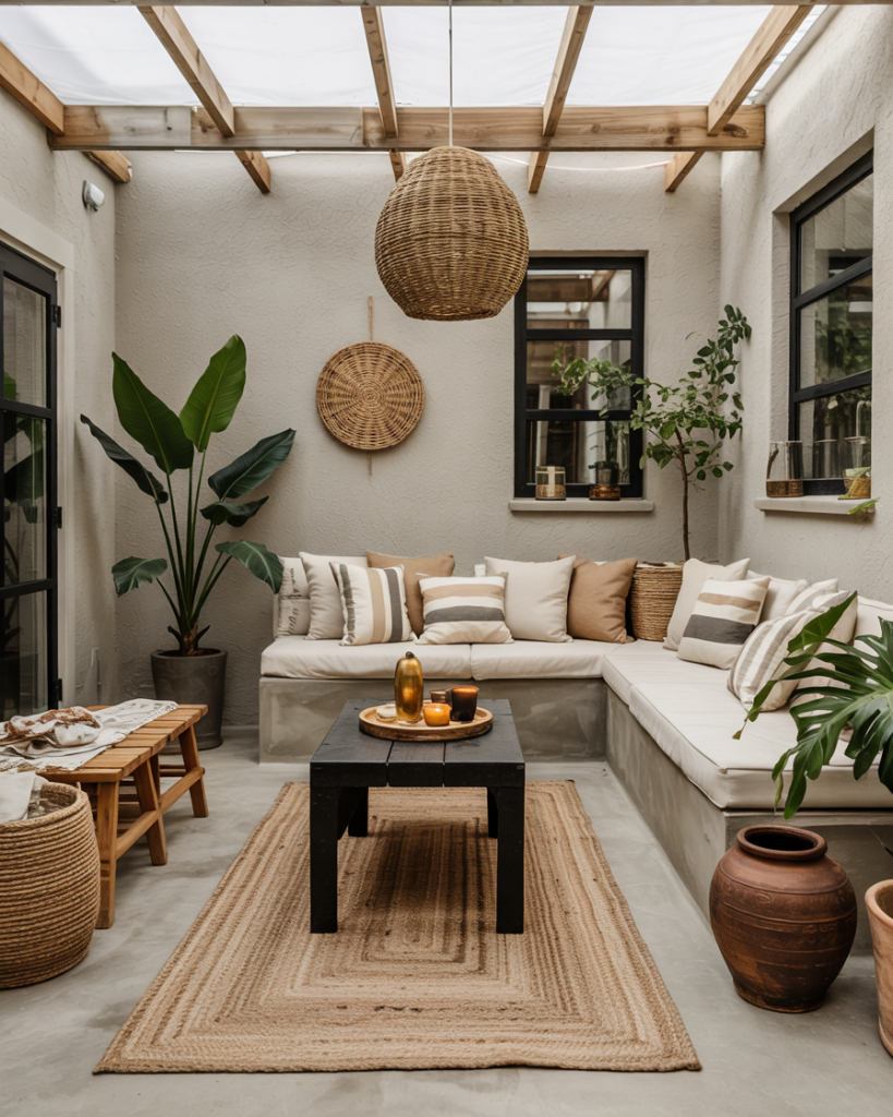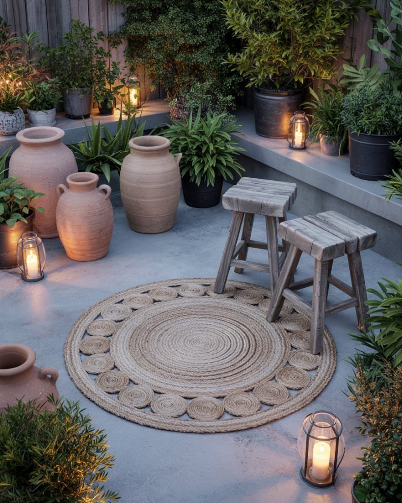 A rustic patio doesn’t need reclaimed barn beams—just texture layered over concrete. Add a jute rug, chunky wood stools, vintage lanterns, and matte pottery for instant warmth. I love how raw floors make greenery stand out, and cleanup is as easy as hosing everything down. Great for dry climates, rental slabs, or anyone who prefers earthy simplicity over polished perfection.