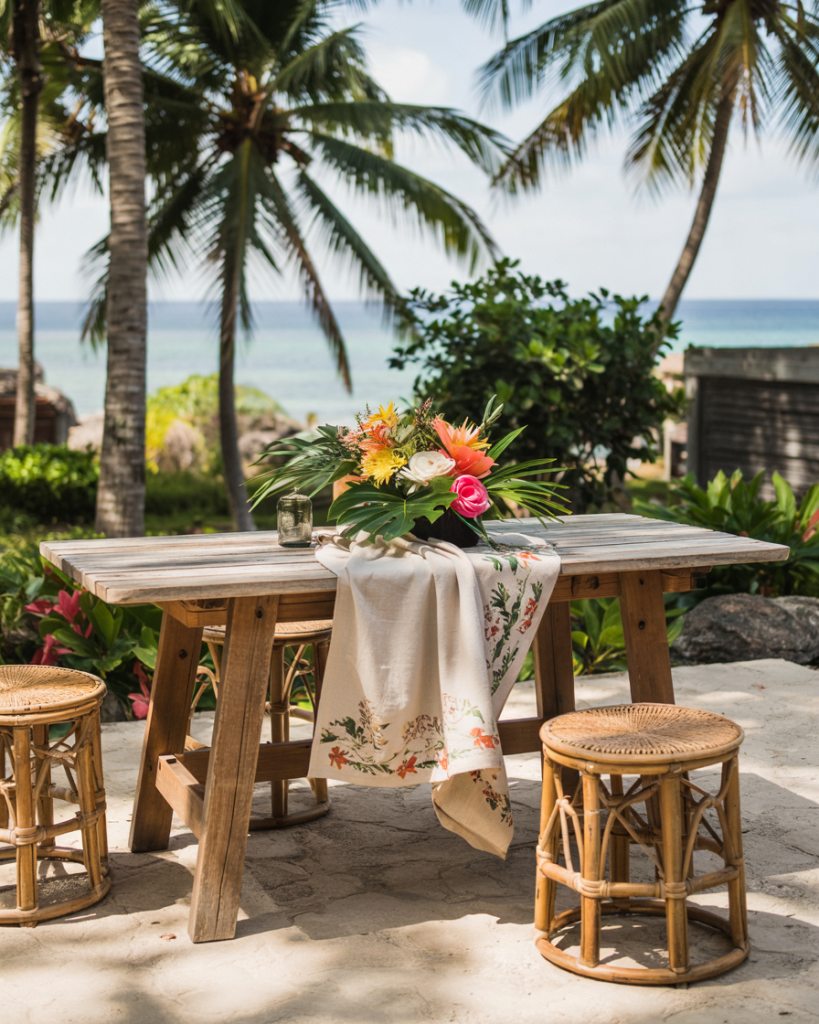 Combine tropical palm trees with rustic wood crates, rattan stools, and linen outdoors for your surf-shack walk. I tried this after coming back from the beach and the combo of leafy plants with rough textured additions made the climate effortless. Perfect for those who are looking for the relaxed, effortless vibe of a vacation spot.