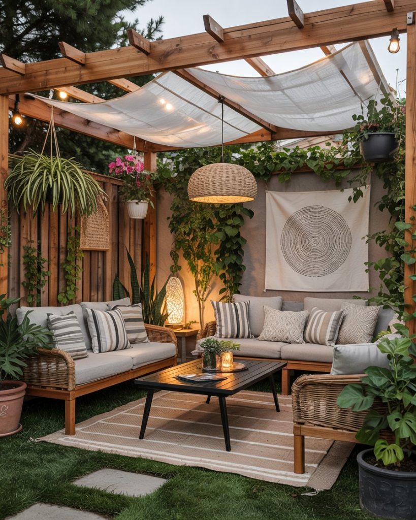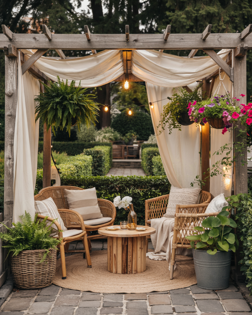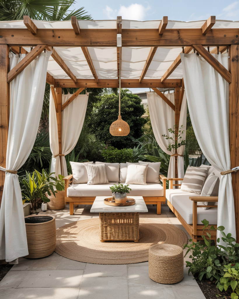 A simple pergola can become a breezy styled space of luxury with grommet curtains and rope tiebacks. I added white sheers to mine, and relaxing summer naps became a thing. It softens the lighting from the suns, and creates a framed seating area with wind movement. Works especially well in large patios with a wide space to walk under the pergola.