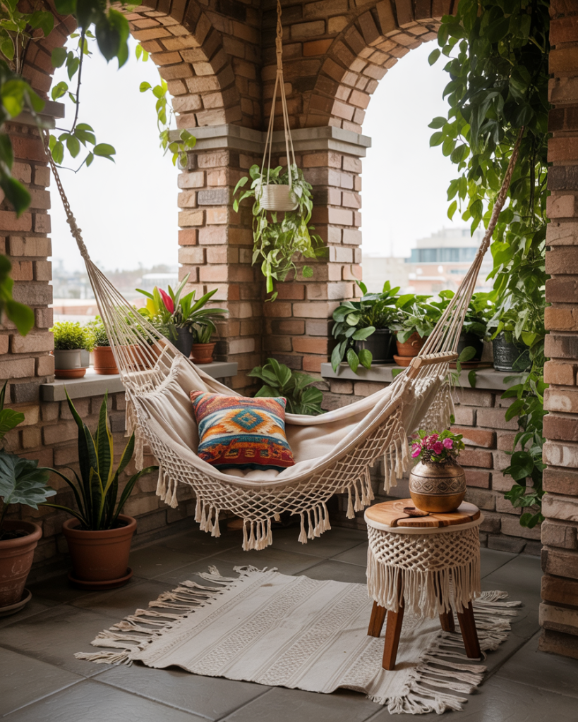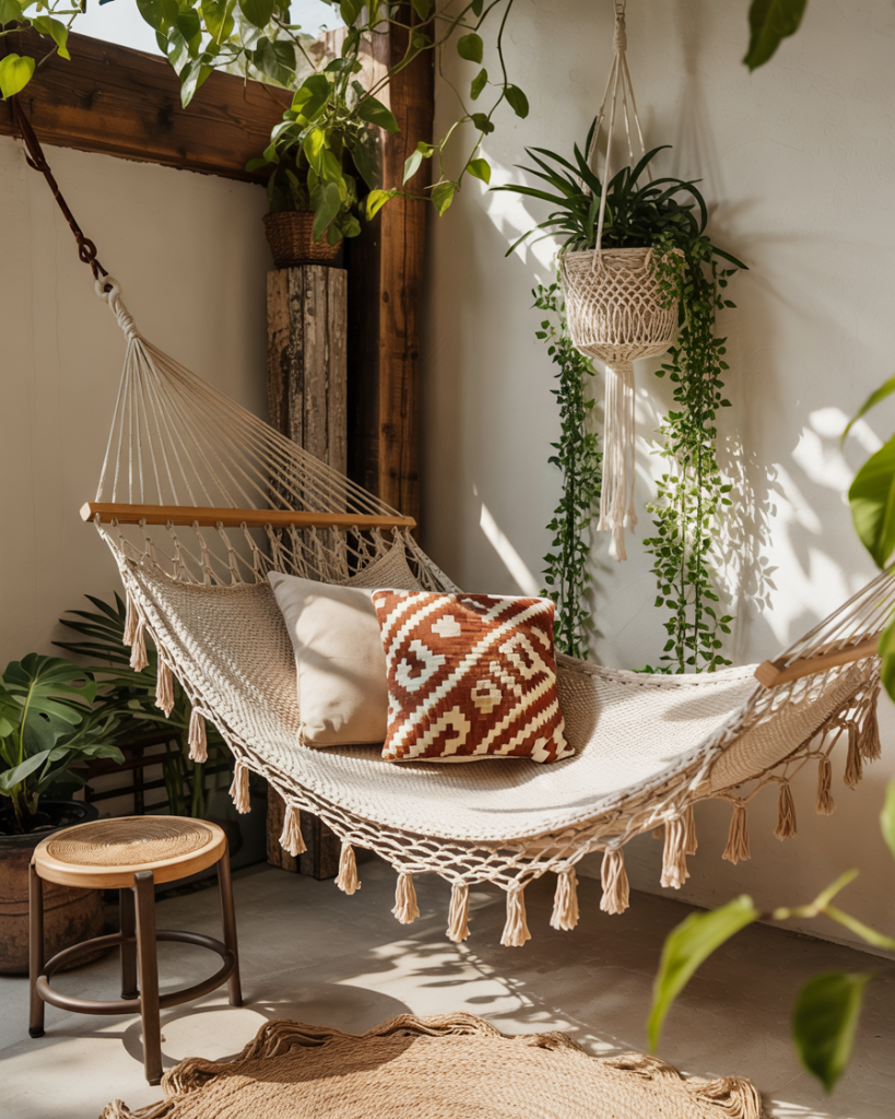 A bohemian hammock hung diagonally across a patio turns wasted corner airspace into the best seat in the house. Add hanging plants, a side stool, and one patterned pillow. I napped in mine all summer and regretted nothing. Perfect for cozy back patios or narrow condo balconies.