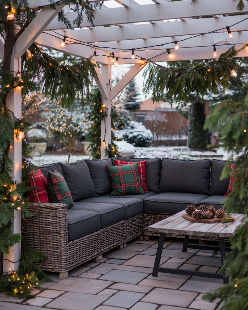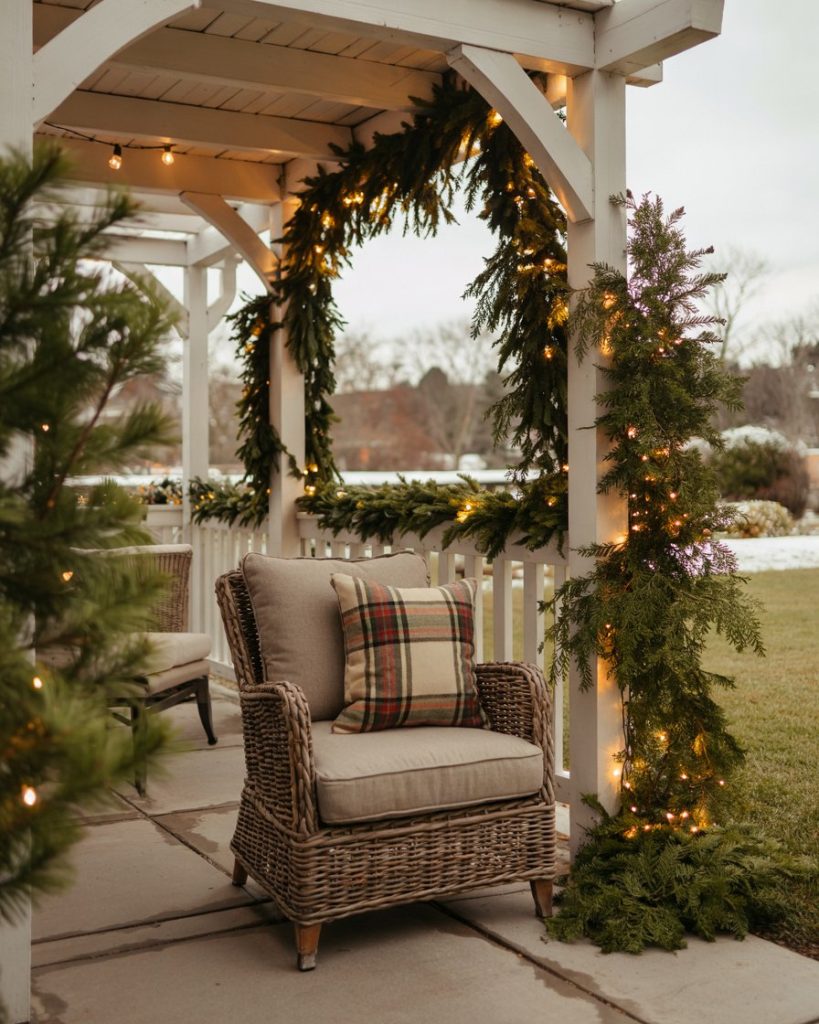 Keeping a hint of Christmas charm outdoors year-round is becoming a quiet trend, especially on covered patios. Instead of Santa figures, think warm white lights, cedar garlands, plaid pillows, and subtle brass bells. My aunt keeps one evergreen swag over her railing all year, and it sparks instant smiles every visit. This idea fits nostalgic decorators who want cozy tradition without the urgency of holiday season storage.