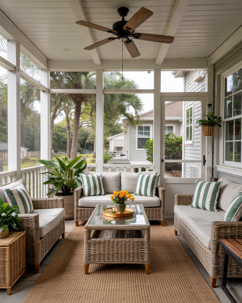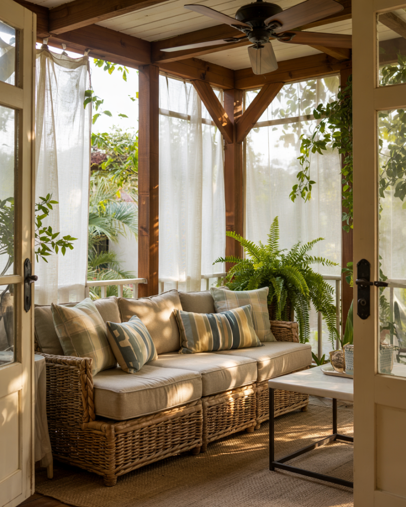 A screened-in patio blends indoor comfort with outdoor air, making it perfect for humid states and mosquito seasons. Add a ceiling fan, breezy curtains, and a narrow console table for drinks or books. I survived a Georgia summer thanks to a screened porch that felt like a bonus living room—pets and guests loved it equally. It’s ideal for families wanting airflow without bug spray.