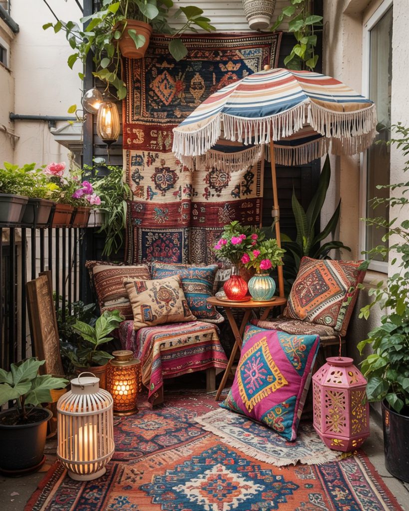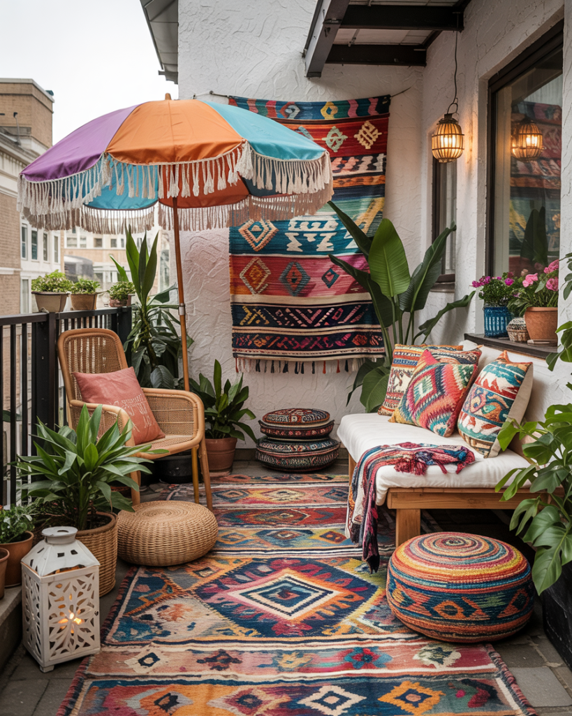 A colorful and bohemian patio thrives in tight quarters like a small apartment balcony because pattern hides scale. Layer mismatched rugs, fringe umbrellas, and jewel-tone pillows to build a dreamy chill zone. I once saw a neighbor transform a 4×8 balcony using nothing but textiles and lanterns—suddenly it felt like Marrakech, not downtown. It’s perfect for free-spirited decorators who embrace playful instead of polished.