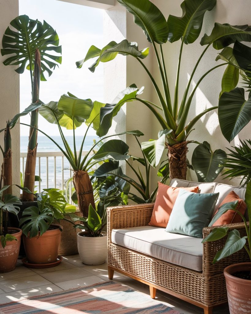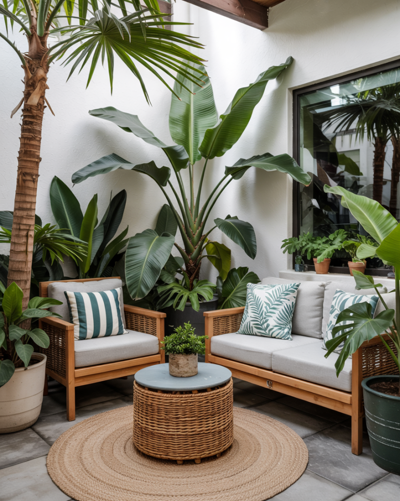 A tropical patio full of lush plants—palms, banana leaves, and monstera—creates vacation energy even on a condo balcony. I once paired tiki torches with citrus trees, and it instantly felt like a resort weekend. More pots mean more shade and privacy, and misting keeps foliage happy in hot states. Perfect for escapists who want to travel without leaving home.