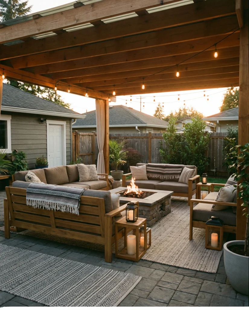 A covered patio has become a must-have in many backyard remodels, especially when homeowners want an outdoor retreat that works in rain or shine. Designers like Emily Henderson note that even a small backyard can feel larger with layered textures, warm lighting, and transitional furniture. This style works well for everyday lounging, family gatherings, or peaceful evenings outdoors.