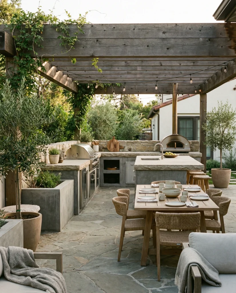A covered outdoor kitchen blends cooking, dining, and lounging in one cohesive outdoor space. Many modern homeowners pair concrete counters with stone backsplashes and a sleek pergola or roof. Influencers like Chris Loves Julia highlight how well this setup works for weekend entertaining. It’s ideal for back patios where families enjoy grilling, sharing meals, and relaxing year-round.