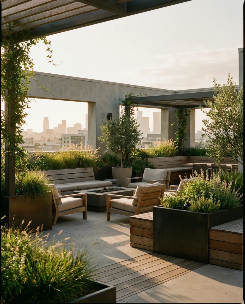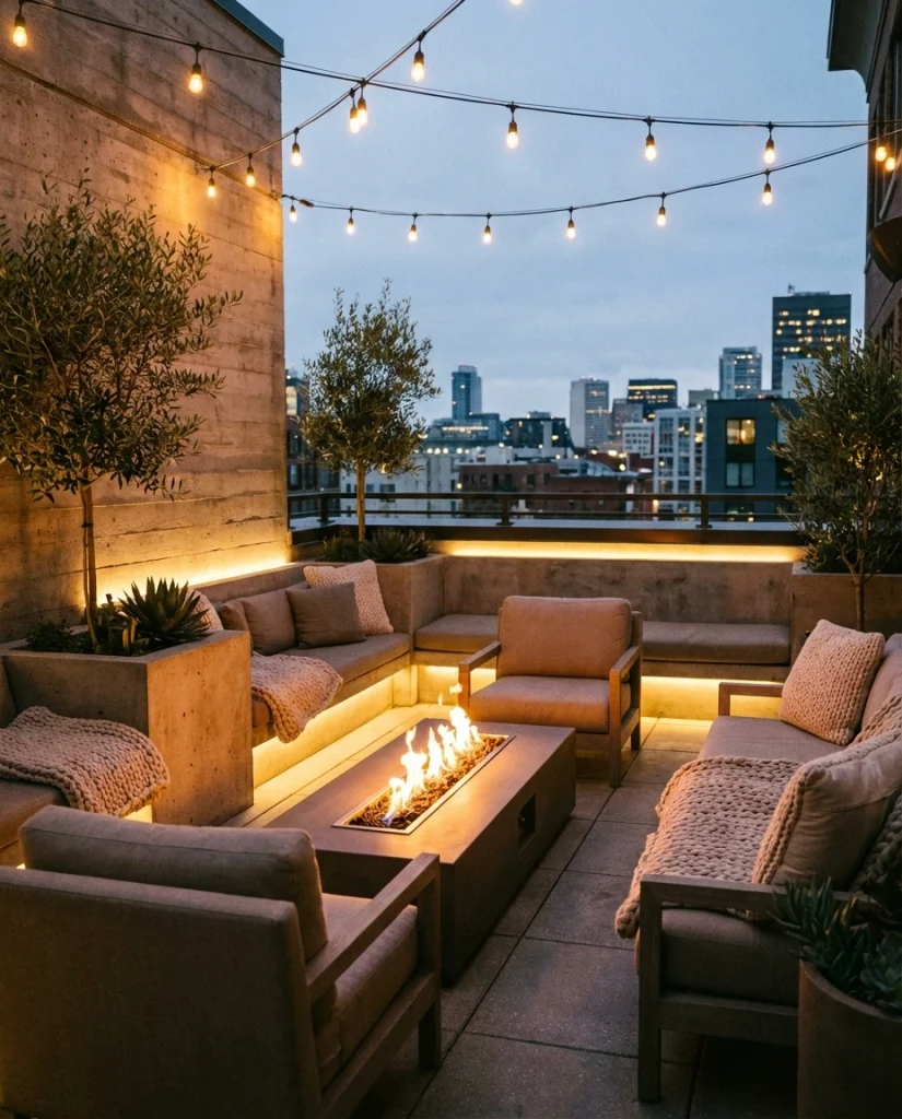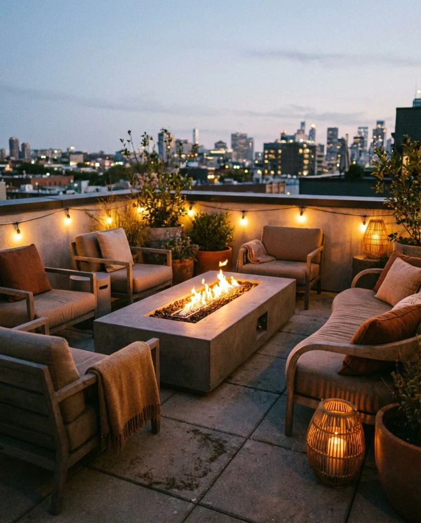 A rooftop lounge featuring a low-back fire table brings a warm atmosphere to urban patios. This trend is growing as more homeowners look for modern ways to unwind above city noise. Designers recommend mixing soft seating with concrete or stone accents for contrast. It’s especially useful for compact apartments wanting an elevated relaxation space.