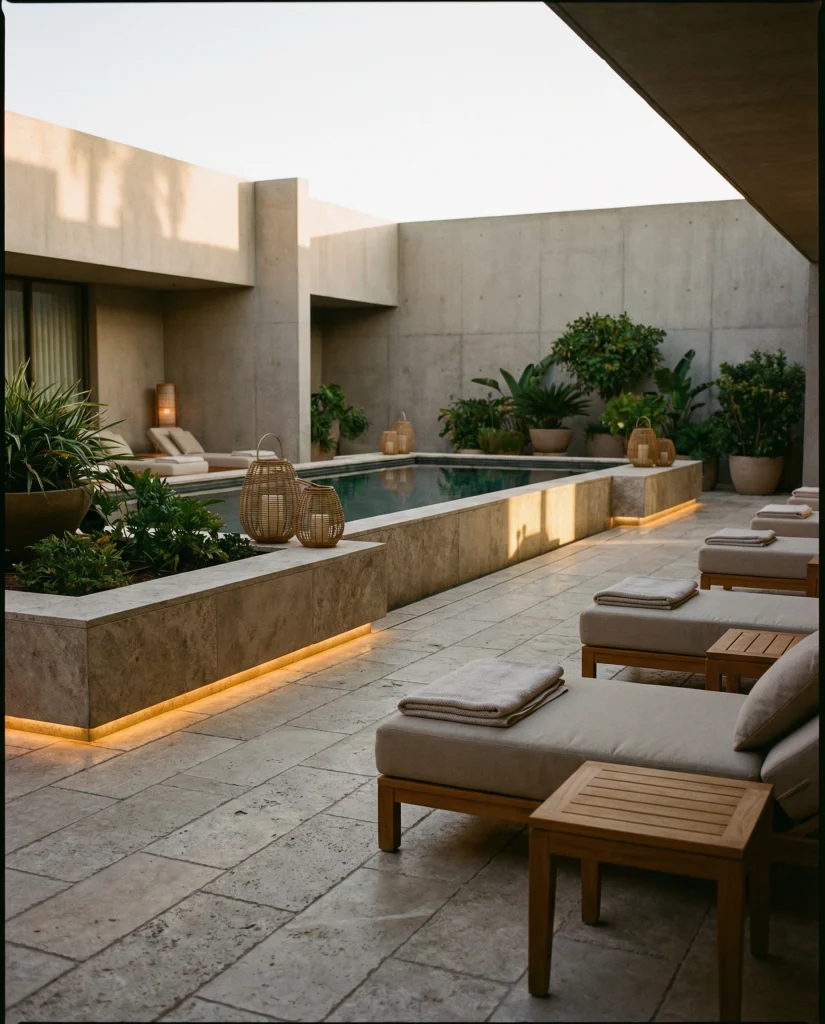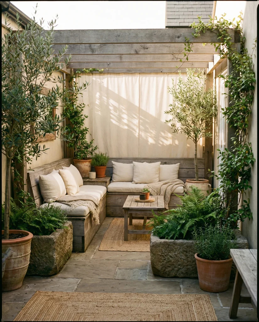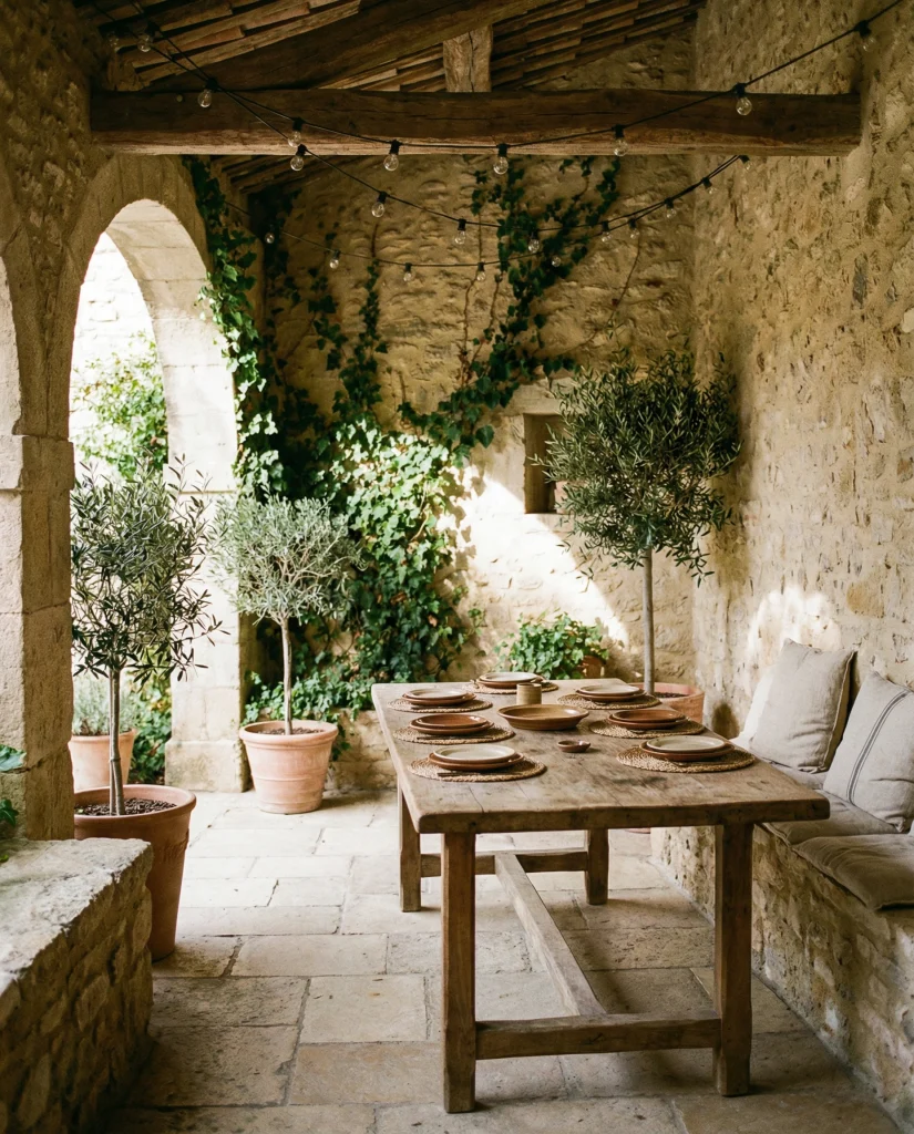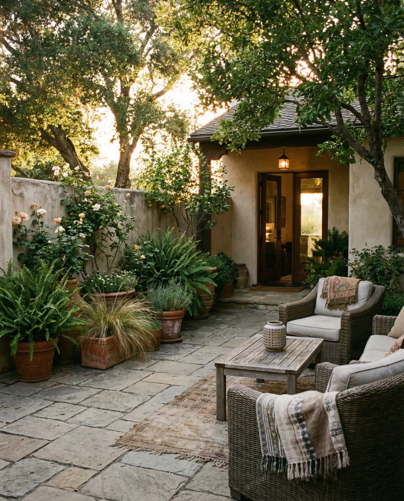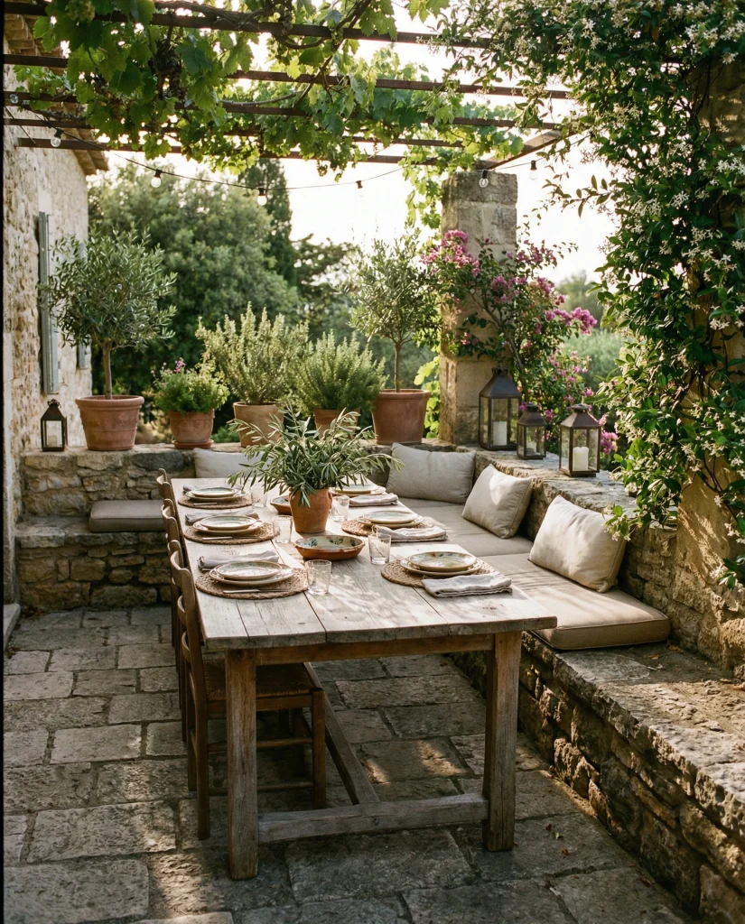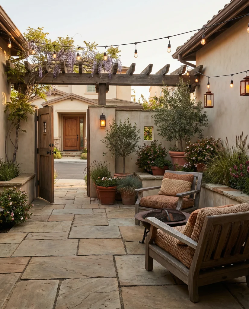 A stone patio inspired by restaurant courtyards creates a relaxed dining mood at home, especially in climates where outdoor meals are frequent. Following Mediterranean influences, designers blend limestone, terracotta, and leafy plants for charm. This works well in both front and back spaces, making even simple homes feel elevated. I’ve seen families quickly adopt this setup for gatherings and weekend brunches.