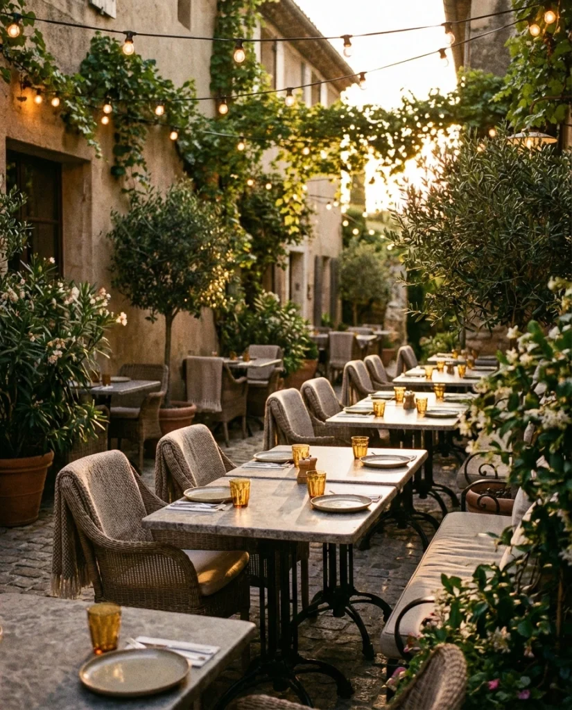 A restaurant-inspired patio uses warm string lighting, stone or concrete tables, and cozy seating to bring café charm to the backyard. This style is often seen in European courtyard ideas, blending greenery with intimate layouts. Influencers in the dining design niche note how lighting is key to creating the right mood. It’s ideal for couples or families who love alfresco meals.