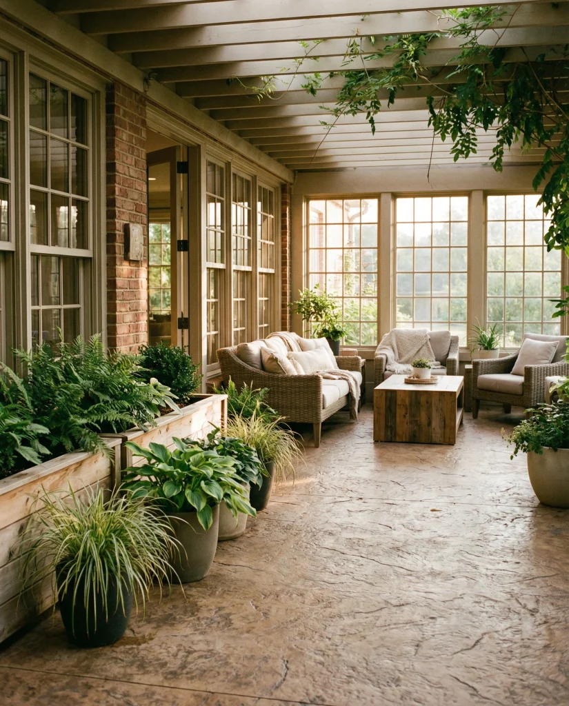 A stamped concrete patio paired with botanical garden edges creates a natural-meets-structured look. This combination suits ideas for backyard upgrades where homeowners want durability and beauty. Many design blogs highlight how stamped surfaces mimic stone while staying budget-friendly. Botanical borders soften the space and bring seasonal color.
