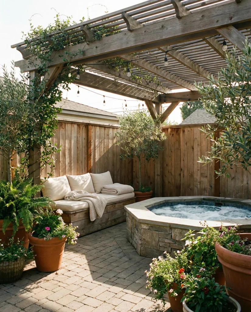 An outdoor hot tub area feels more immersive when framed by a pergola and wooden privacy panels. This design is popular in backyard concrete or paver settings where homeowners want a spa-like retreat. Designers often recommend adding soft lighting and greenery to enhance relaxation. It suits both singles and families seeking a peaceful escape.