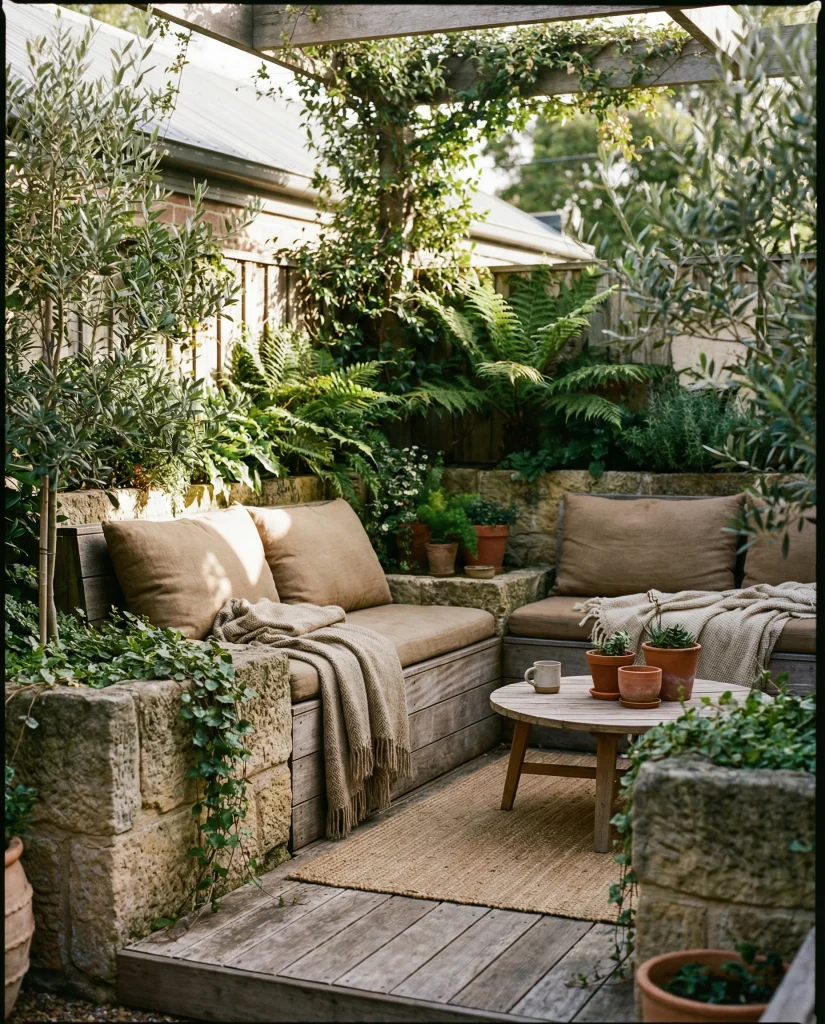 A small backyard lounge can feel spacious with built-in stone planters that frame seating areas. This technique comes from urban landscape ideas, where maximizing space is crucial. Designers suggest mixing low and tall plants for softness. It’s an excellent solution for compact homes needing calm, functional outdoor seating.