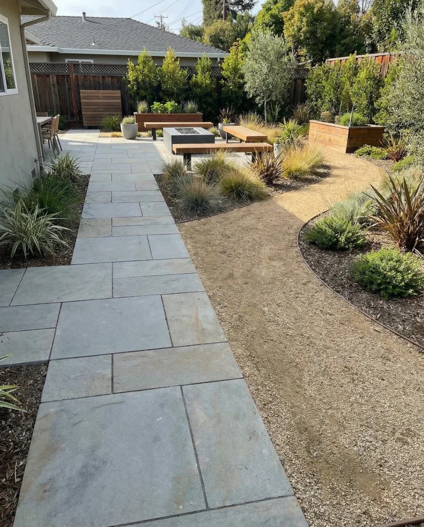 A paver walkway connecting the back patio to the garden creates a seamless flow. This style uses repeating textures and clean lines to tie the spaces together. Many blogs highlight how walkway connections make the entire yard feel larger. Ideal for homeowners who want simplicity with a strong visual structure.