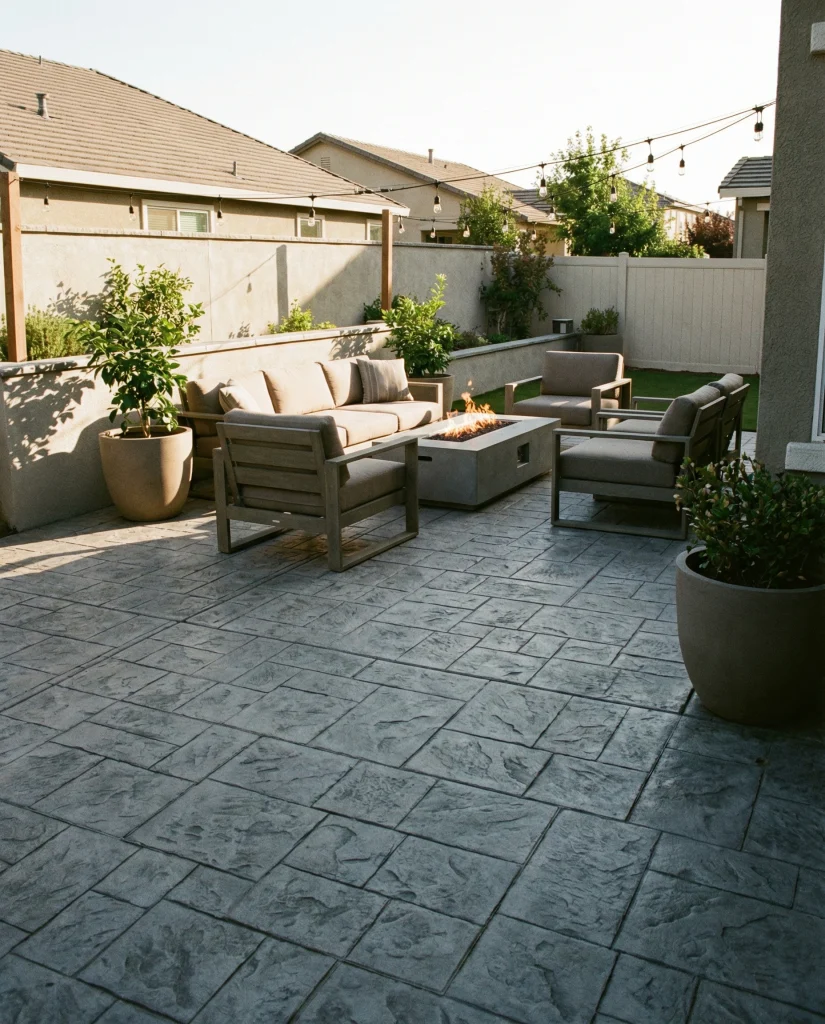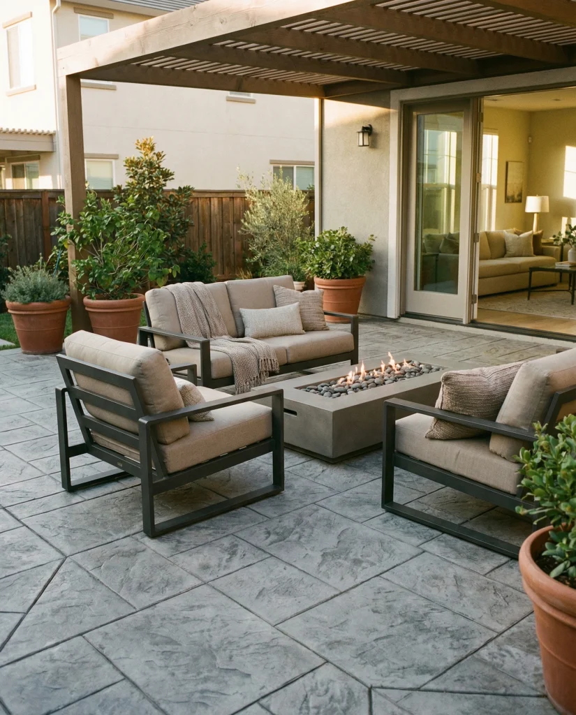 A concrete patio with stamped concrete patterns is trending for homeowners wanting a luxury look without the cost of real stone. This modern outdoor approach works beautifully in backyard concrete layouts and is praised by designers like Studio McGee for its durability. Whether styled with sectional seating or a fire feature, stamped surfaces create a clean, structured atmosphere that feels both fresh and timeless.