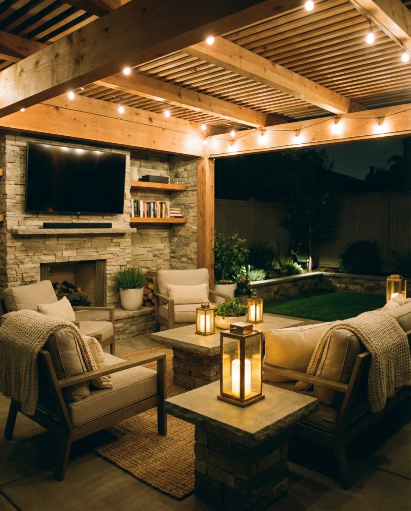 With the rise of outdoor TV ideas, many back patios now function as entertainment hubs. Weather-rated screens paired with covered pergolas make it possible to enjoy movies, sports, or gaming outside. Designers like Bobby Berk highlight that even a small backyard can support this setup when arranged thoughtfully. Add soft seating, stone accents, and layered textures for a welcoming evening hangout.