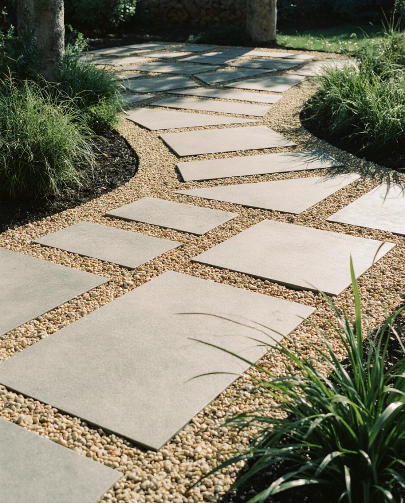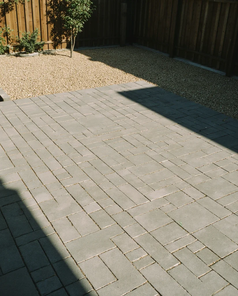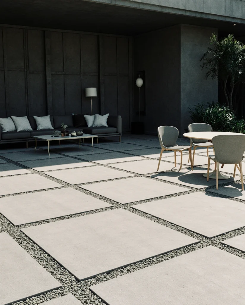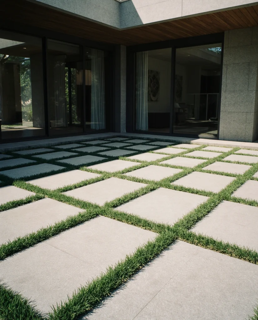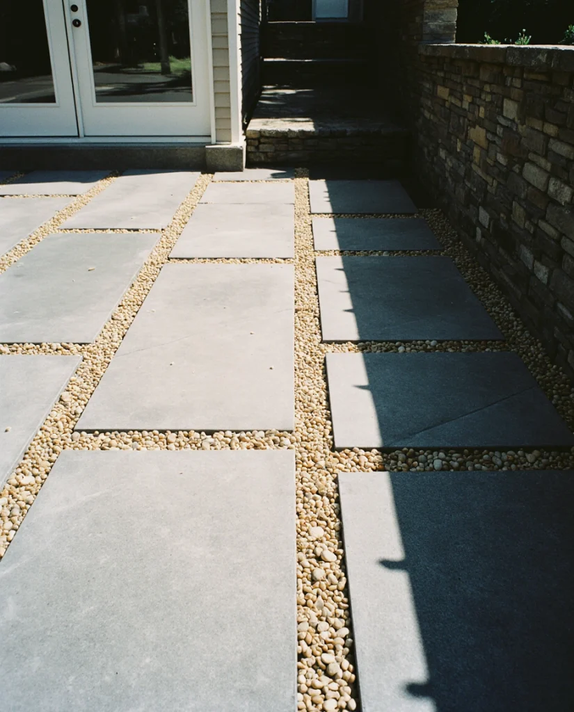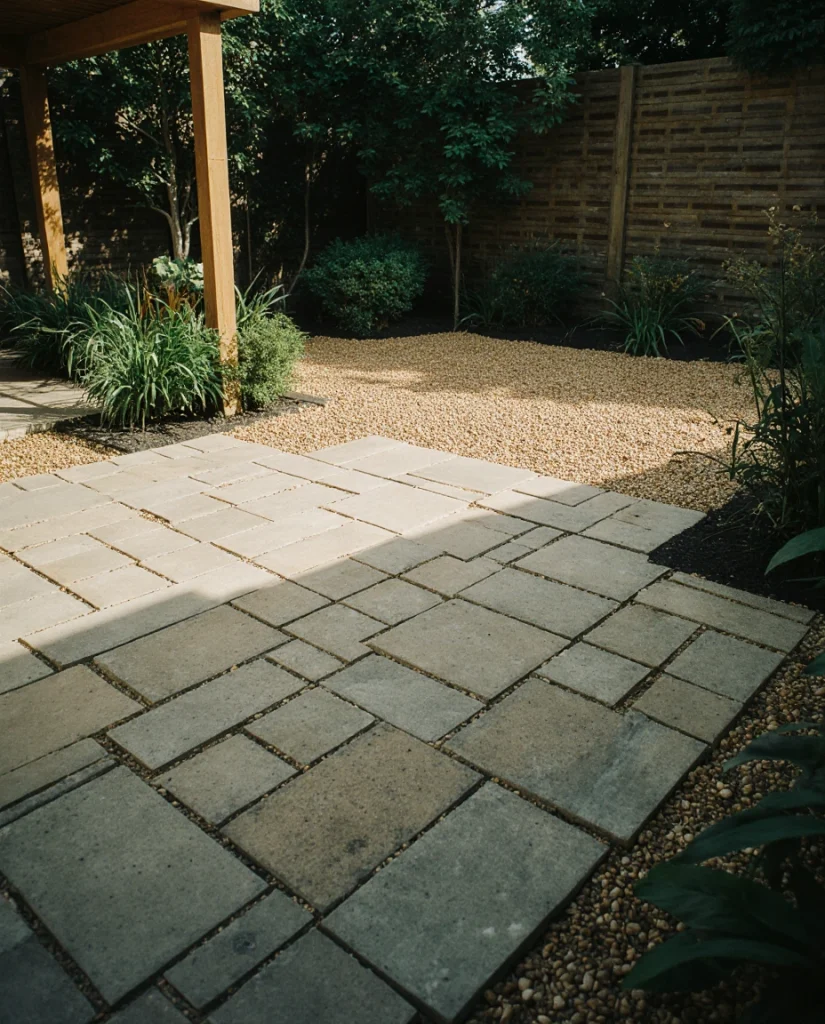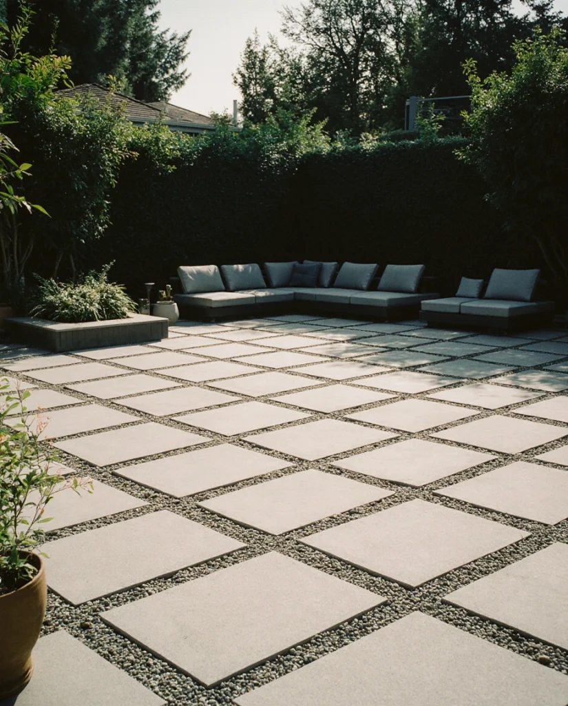Large square paver grids alongside gravel and infill give a patio a modern, breathable effect. It works best in climates where there is a lot of rain, as the gaps help drainage. I often hear homeowners appreciate the softness and structure. It is a contemporary design without being cold.