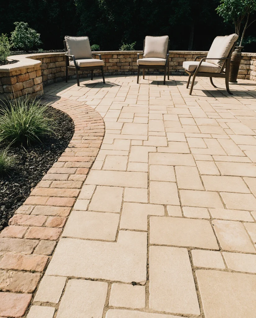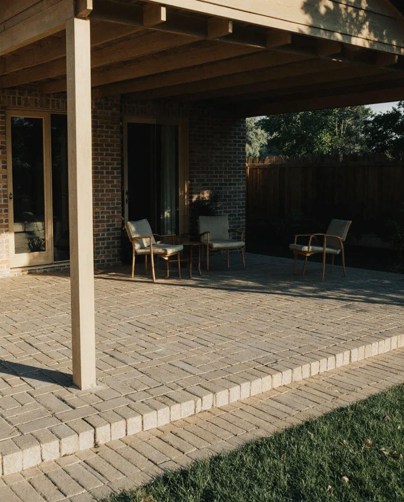 Adding a decorative border made from brick and natural stone gives a paver patio a polished, finished look while remaining friendly to ideas on a budget. The contrast between materials creates visual structure and helps define seating or dining areas. Homeowners often mention how this small upgrade makes their backyard feel professionally designed without requiring major construction.