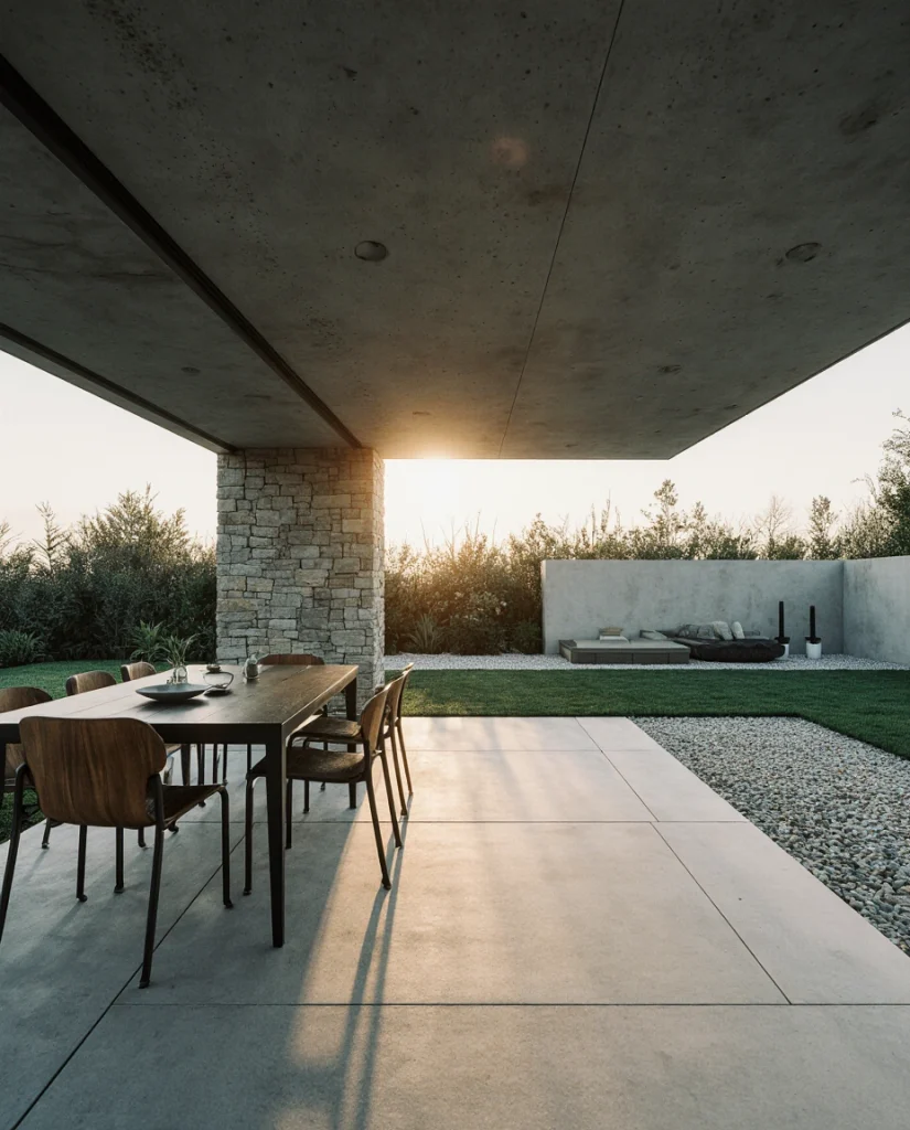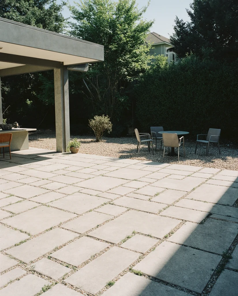 A large grid of square concrete slabs creates an airy, modern patio that suits minimalistic lifestyles. Paired with gravel and soft plantings, the look feels both refined and simple. Many young homeowners appreciate the easy maintenance and the flexibility for adding furniture without clutter.