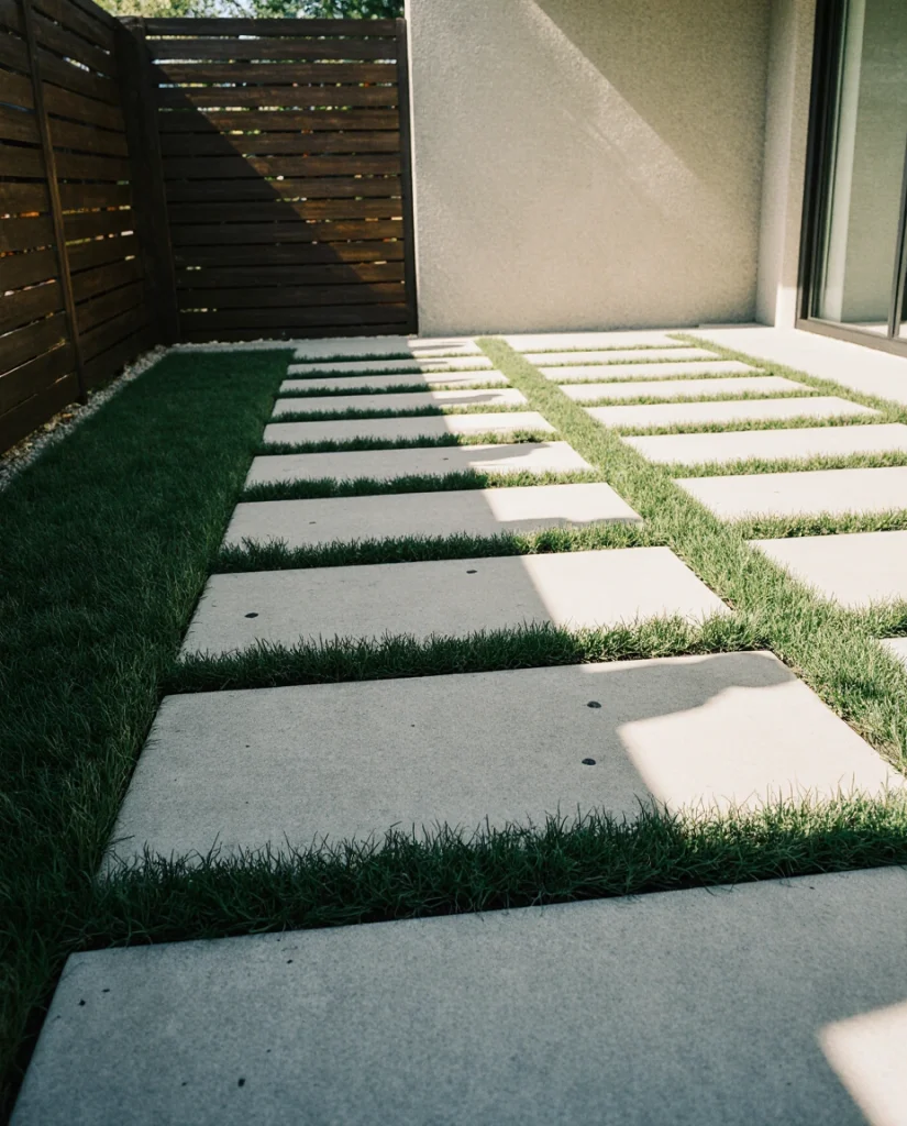 Alternating cement slabs with thin lines of artificial turf produces a sleek, sporty look reminiscent of modern California design. This layout is low-maintenance and adds green texture without watering. I’ve seen active families use it to create an outdoor space that feels playful yet tidy.