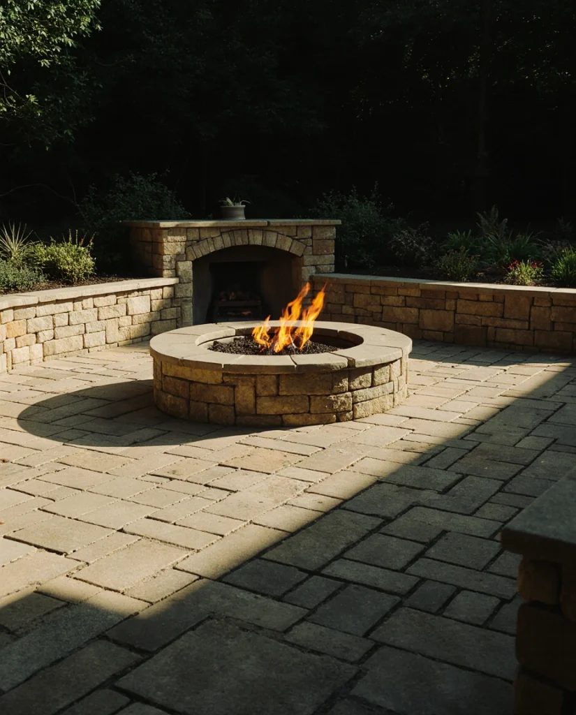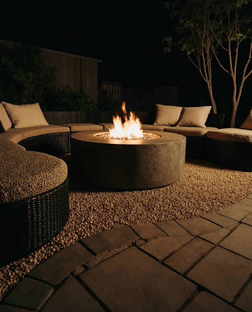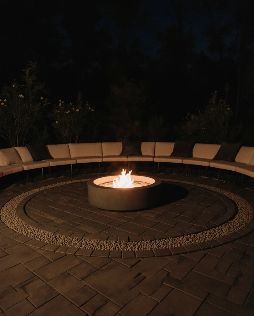 Creating a round paver zone with a central fire pit gives the patio a nostalgic, campfire-style charm. Using pea gravel or Ideas paving stones, pea gravel around the perimeter softens the shape, making it perfect for gatherings. Many families tell me this setup becomes their go-to space for fall evenings and long conversations.