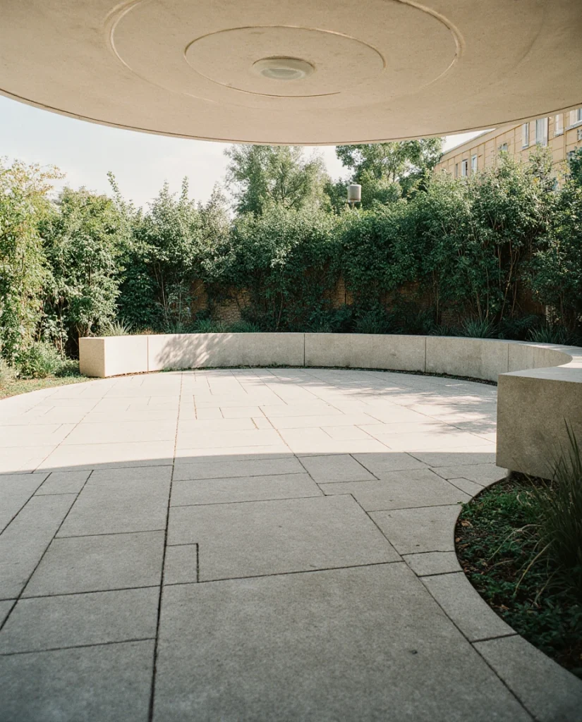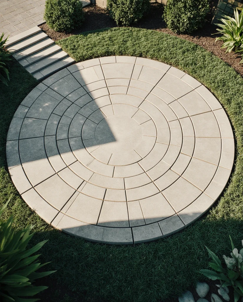 A round cement pad is perfect for homeowners who love the sculptural look of curved architecture. Surrounded by plants or decorative gravel, it becomes a natural stage for loungers or a bistro set. Many people enjoy the softness of the shape because it breaks up square yards beautifully.