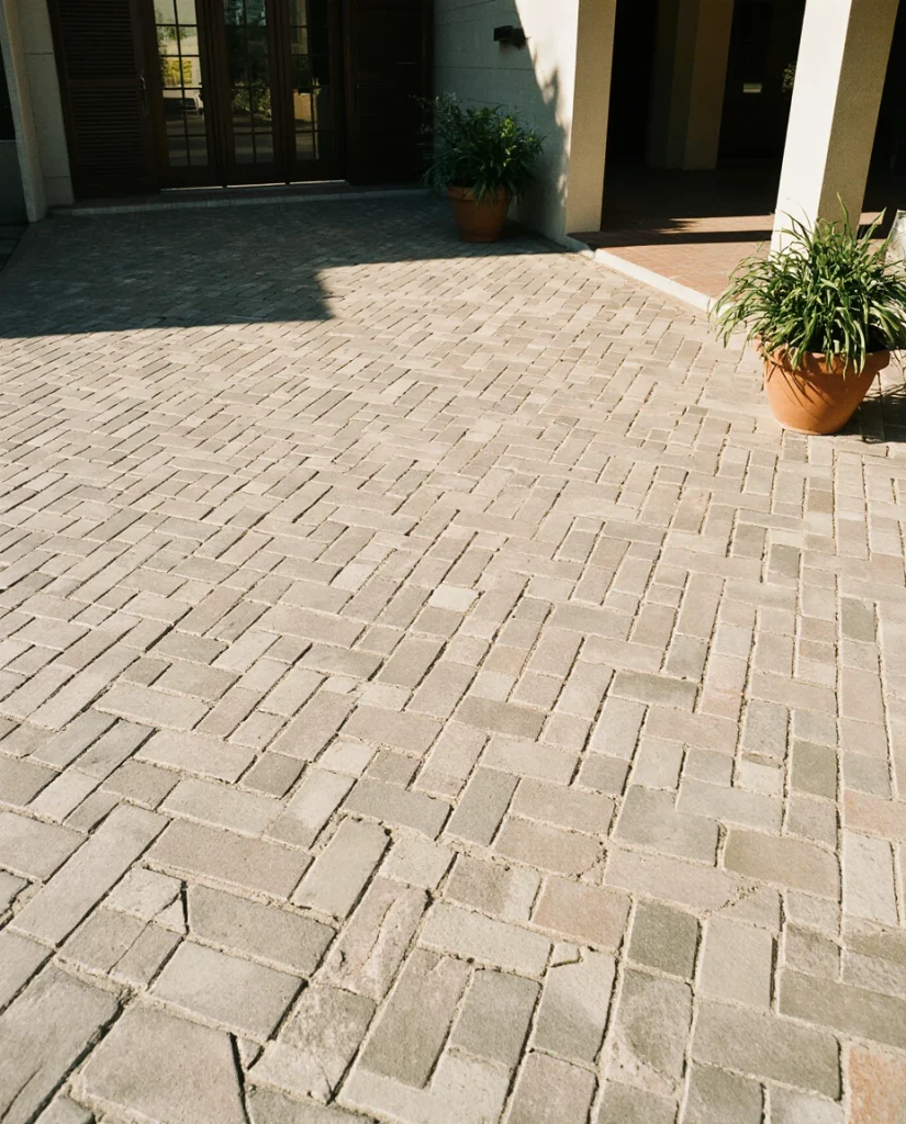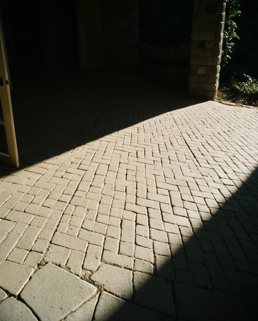 A herringbone pattern made with cement pavers gives an entry or walkout patio a timeless, architecturally rich appearance. It’s durable, easy to keep clean, and works well for high-traffic areas. Many homeowners choose it because it instantly elevates everyday paths.