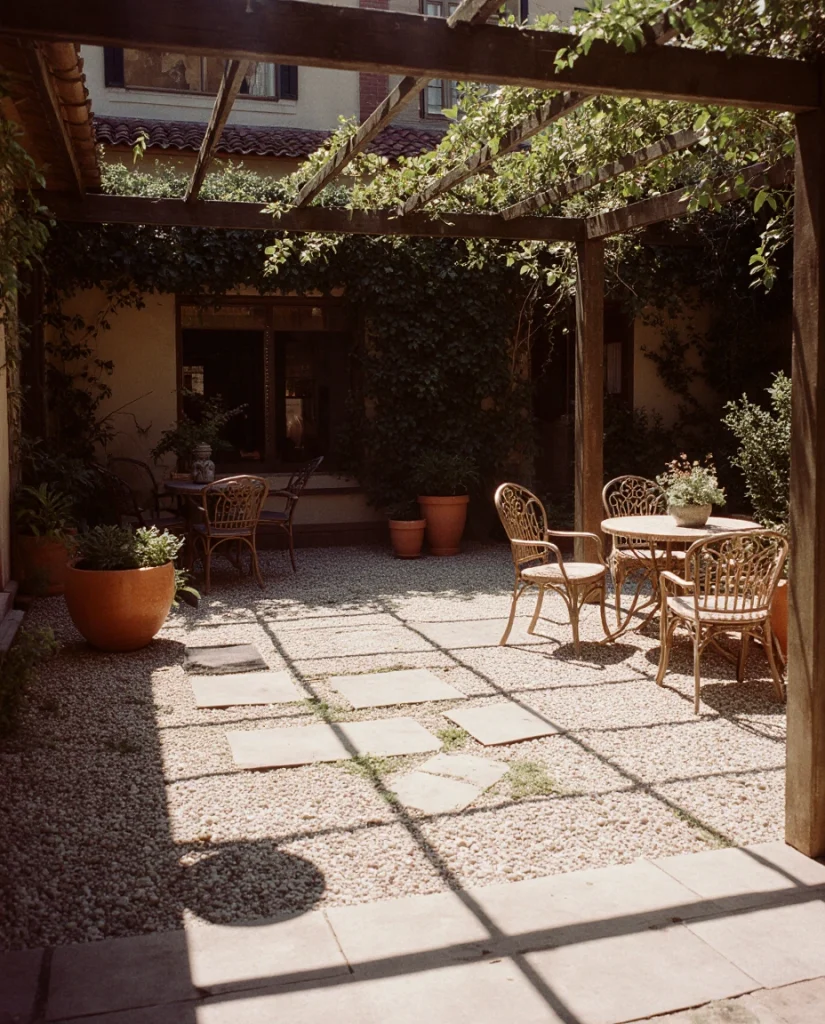 Mixing ideas, paving stones, and pea gravel into a courtyard-style layout creates a breezy, European-inspired environment. The combination keeps the space cool, quiet, and adaptable for anything—from homework sessions to casual wine nights. I often hear that this style feels surprisingly relaxing.