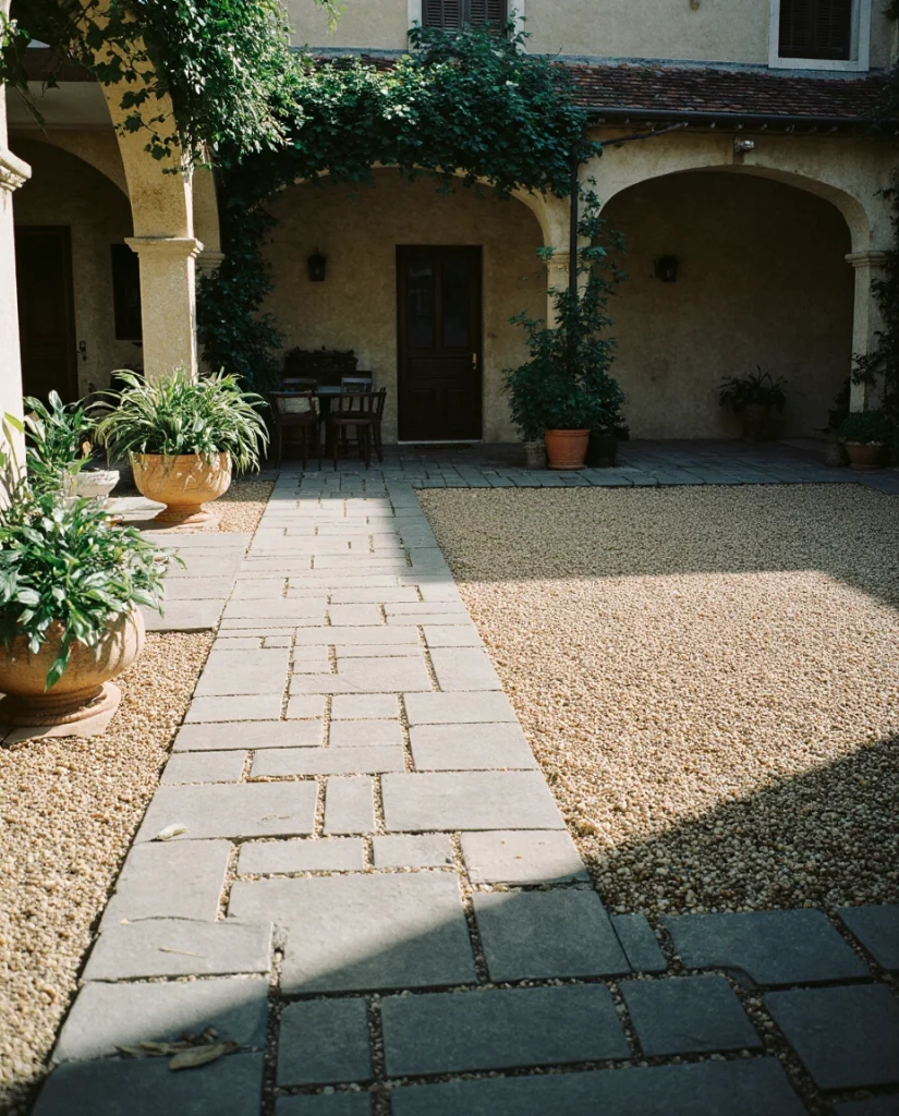 Blending Pea gravel with cut Stone pavers offer a rustic-elegant feel that adapts to both structured and organic layouts. This is a favorite among homeowners who want flexibility—easy to expand, reshape, or maintain. The soft crunch of gravel adds a comforting sensory element.