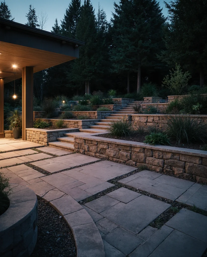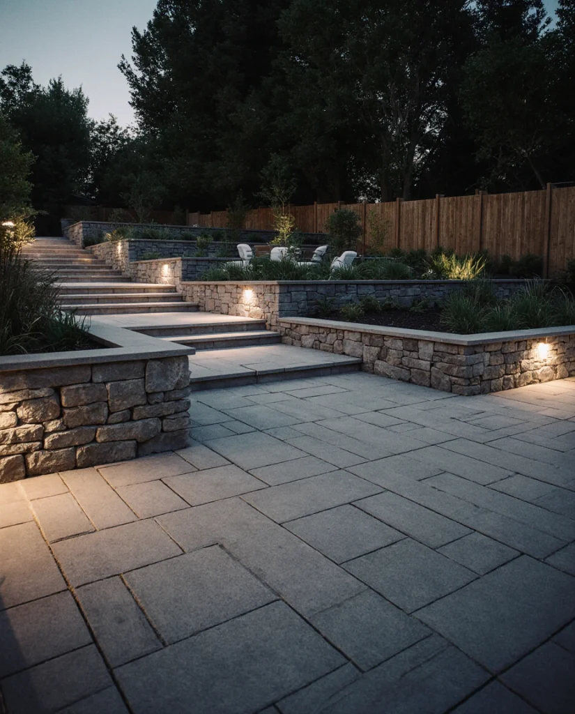 A raised paver patio framed with natural stone creates architectural dimension and a polished setting. This approach often appeals to families who love multi-level living outdoors. I’ve seen homeowners uplift a sloped backyard with this idea, using designs that feel integrated and practical for dining and lounging.
