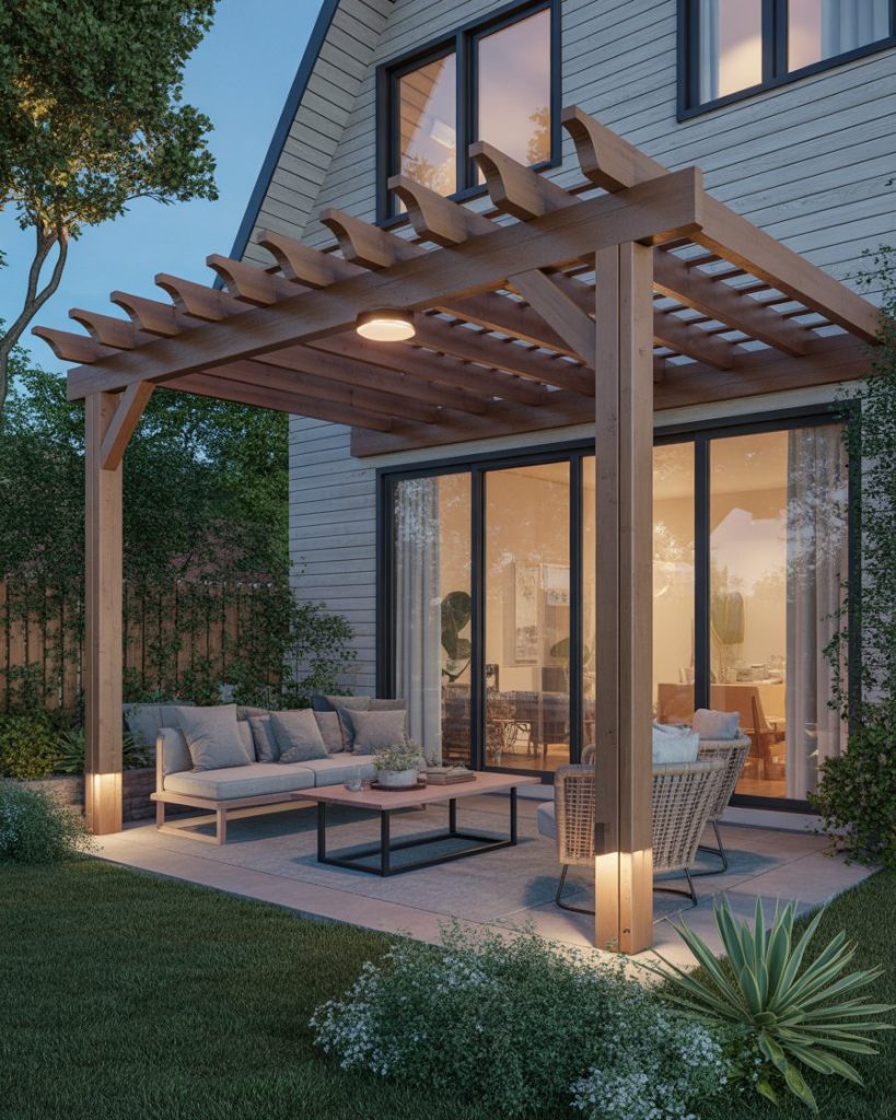 A pergola built over a patio dining setup brings structure and shade while keeping the outdoor space airy. Many homeowners pair it with string lights and simple wooden beams for a warm, welcoming look. This idea works well for small families who enjoy meals outside without feeling fully covered or enclosed. It’s especially practical when your dining table sits close to the backyard entrance.