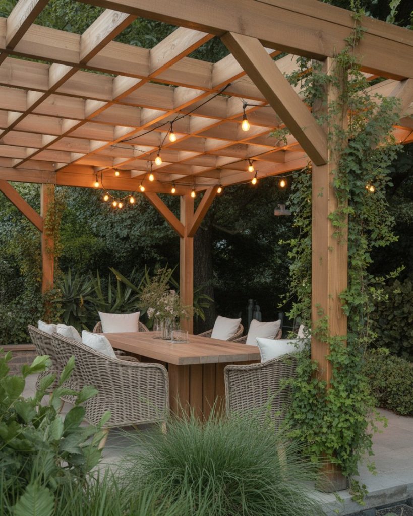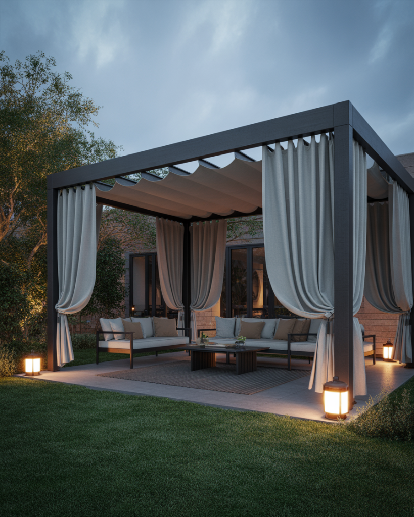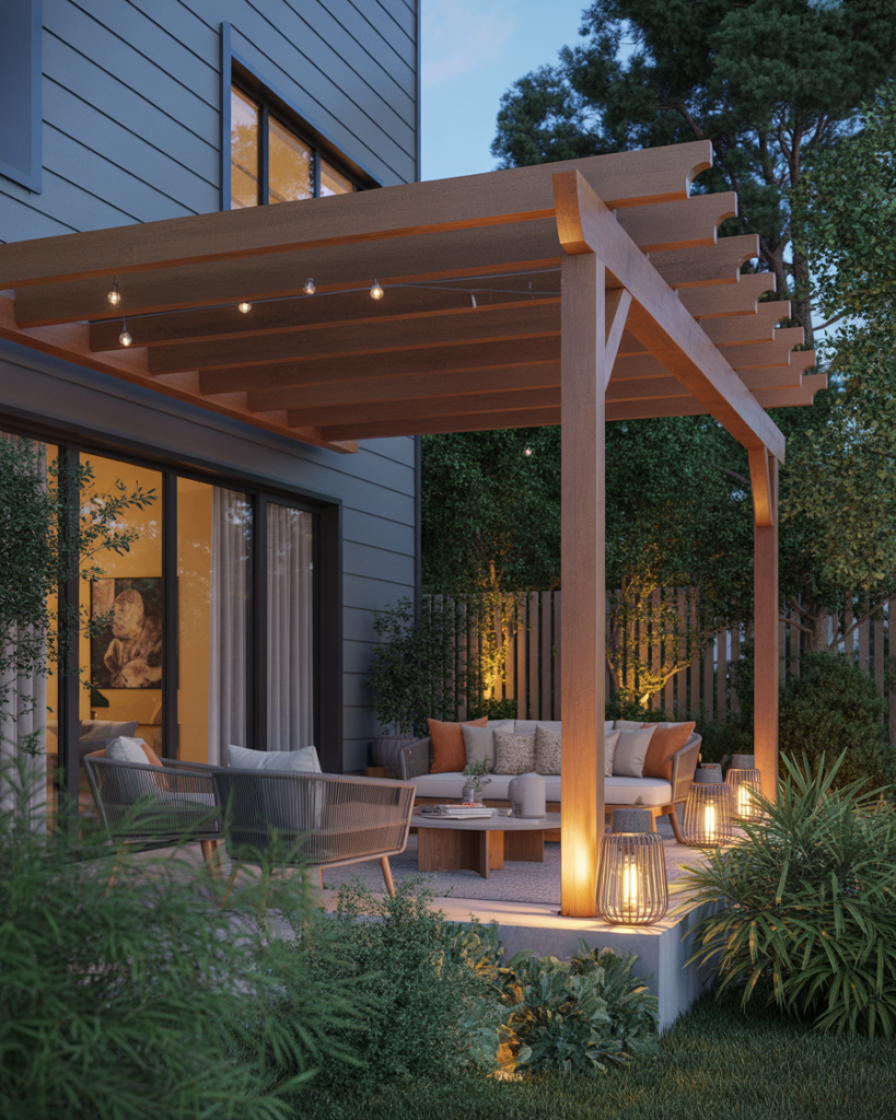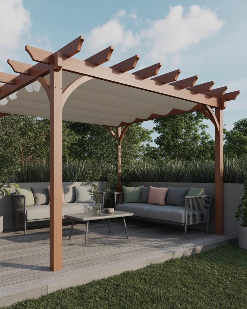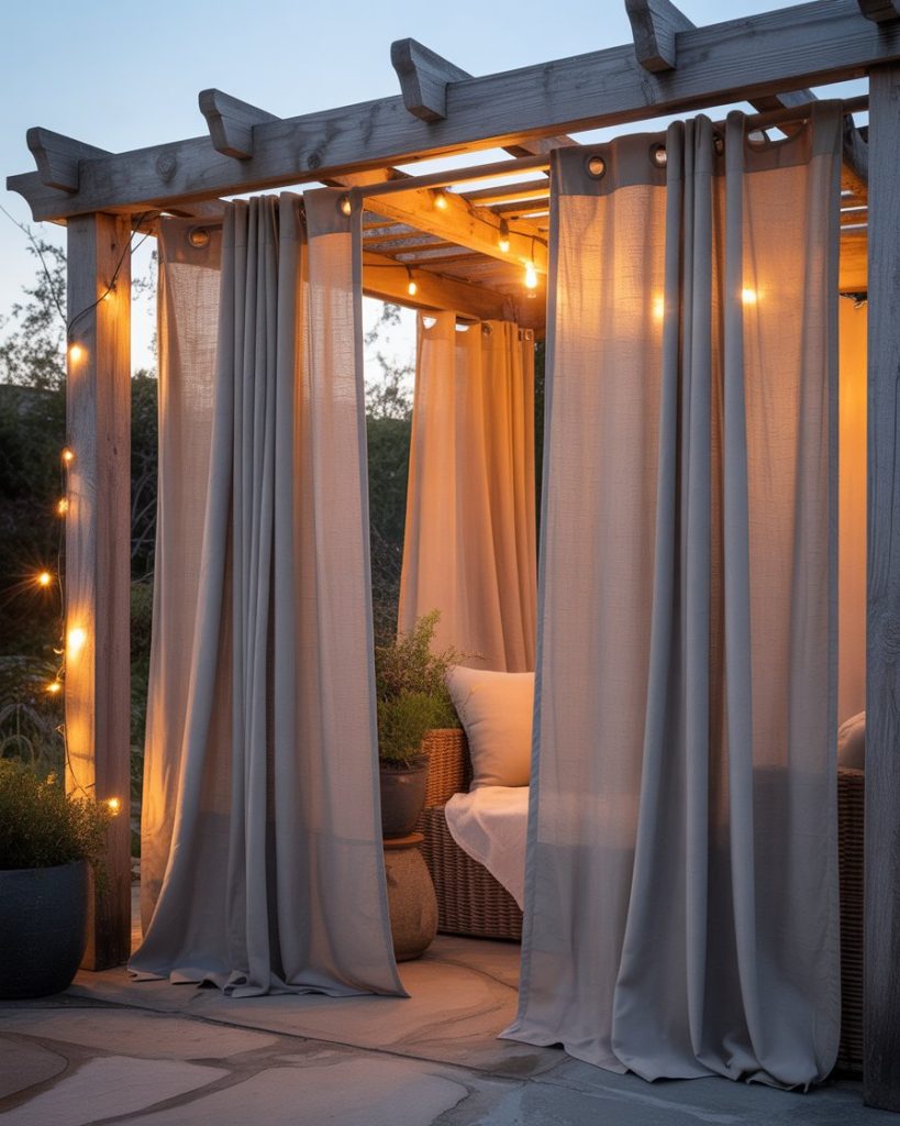 A pergola with fabric curtains gives homeowners control over privacy and sunlight, making it feel semi-enclosed. This idea works well for patios that sit close to neighbors or busy streets. It offers softness, movement, and a cozy atmosphere, especially when styled with lanterns and textured rugs. Many people appreciate how easy it is to update fabrics seasonally.