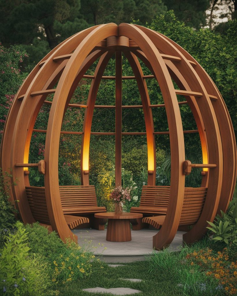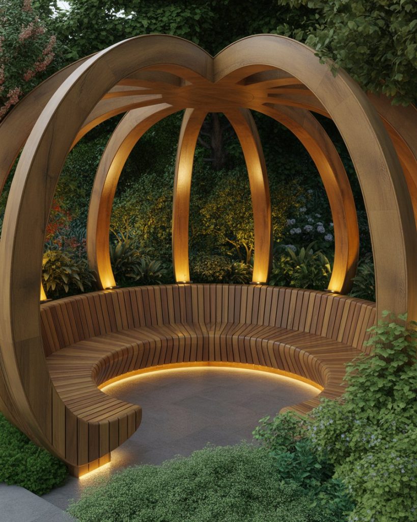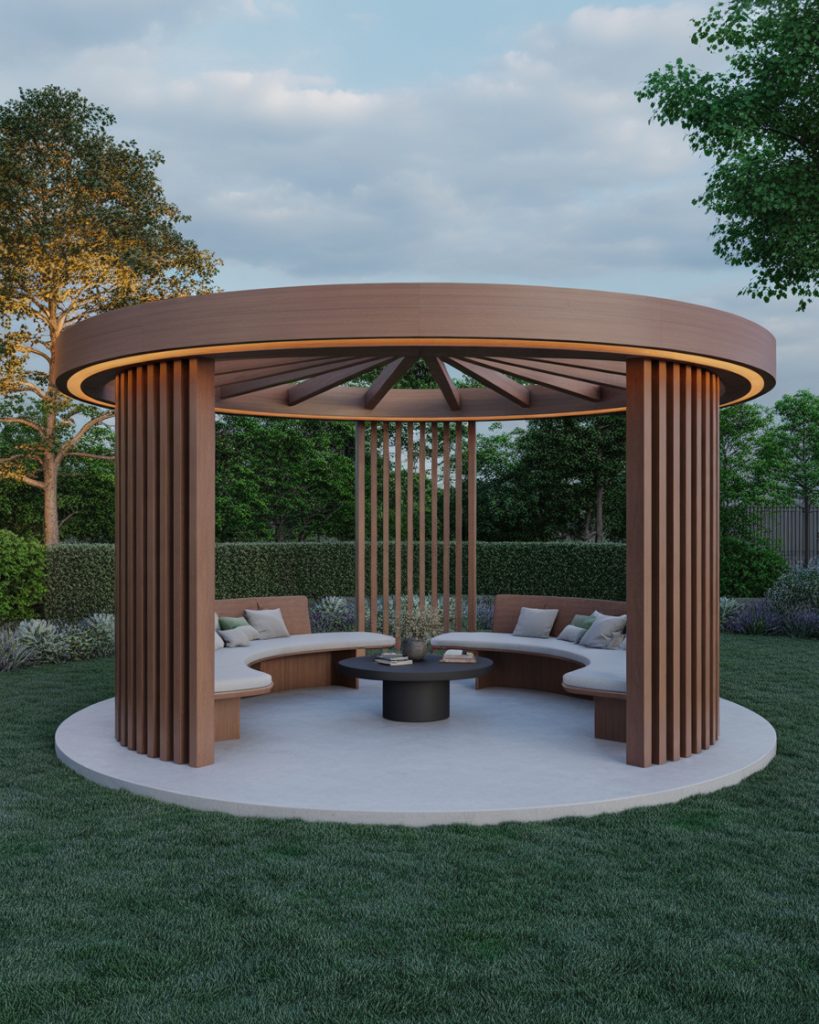 A round pergola combined with built-in benches offers a welcoming space for gatherings. Its curved form encourages conversation and feels softer than traditional square frames. Homeowners use it for small parties, morning coffee, or quiet reading sessions. This design shines in open backyard lawns or near flower beds.